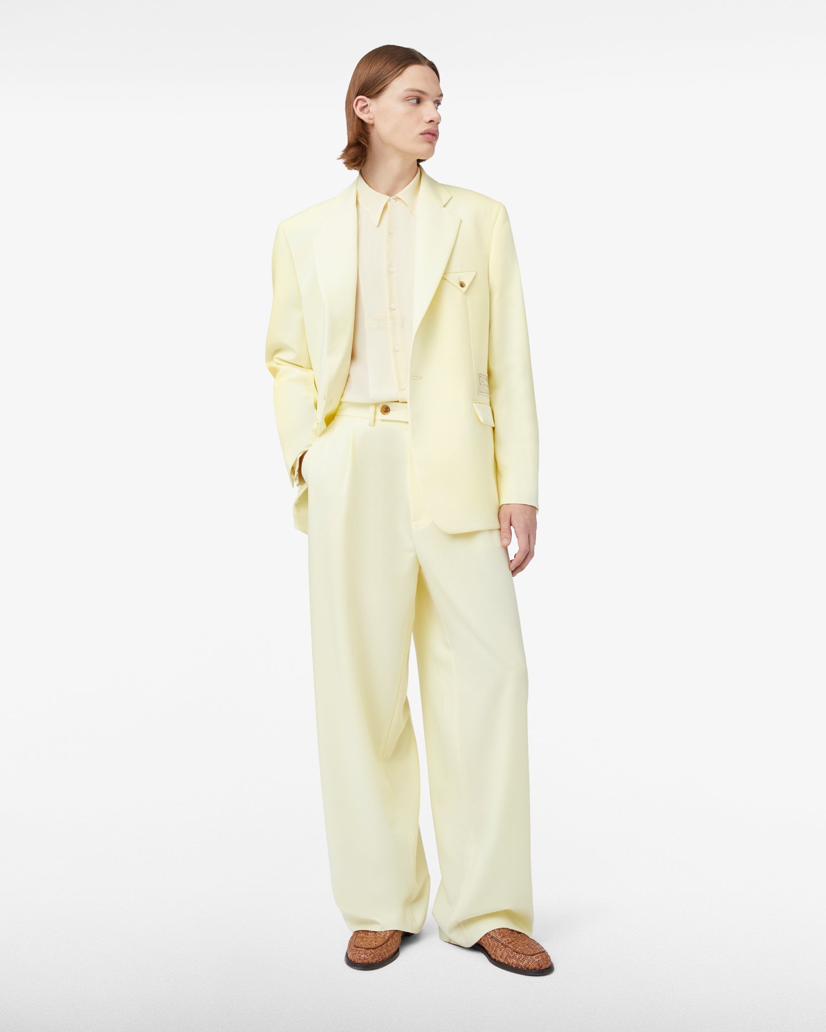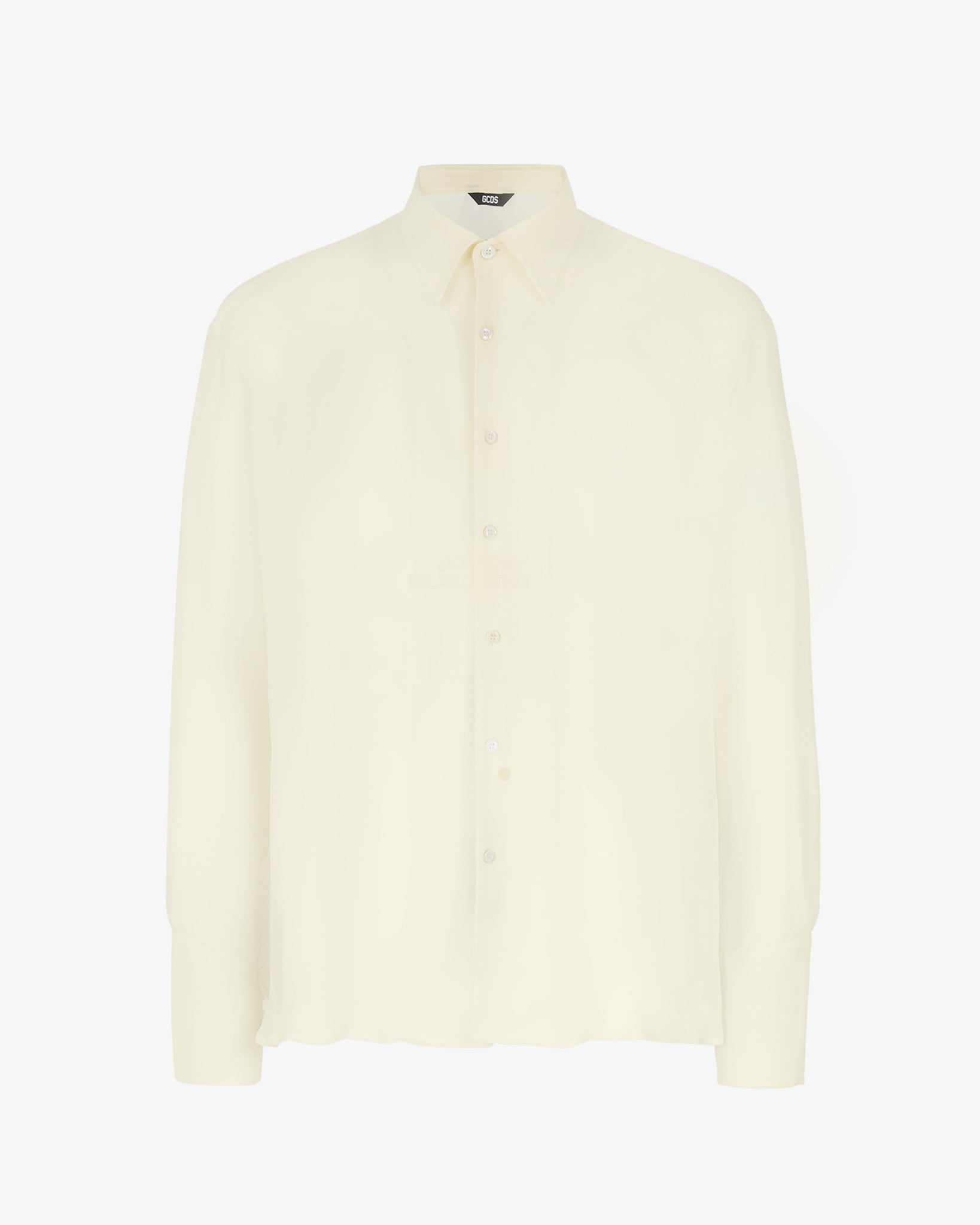 Georgette shirt with a see-through effect notched collar. Long cuffs with a double button. Front closure with mother-of-pearl buttons and embroidered "GCDS Wear" logo.