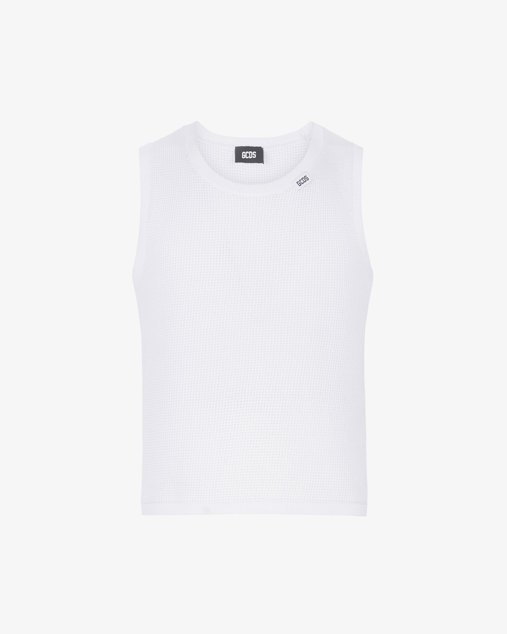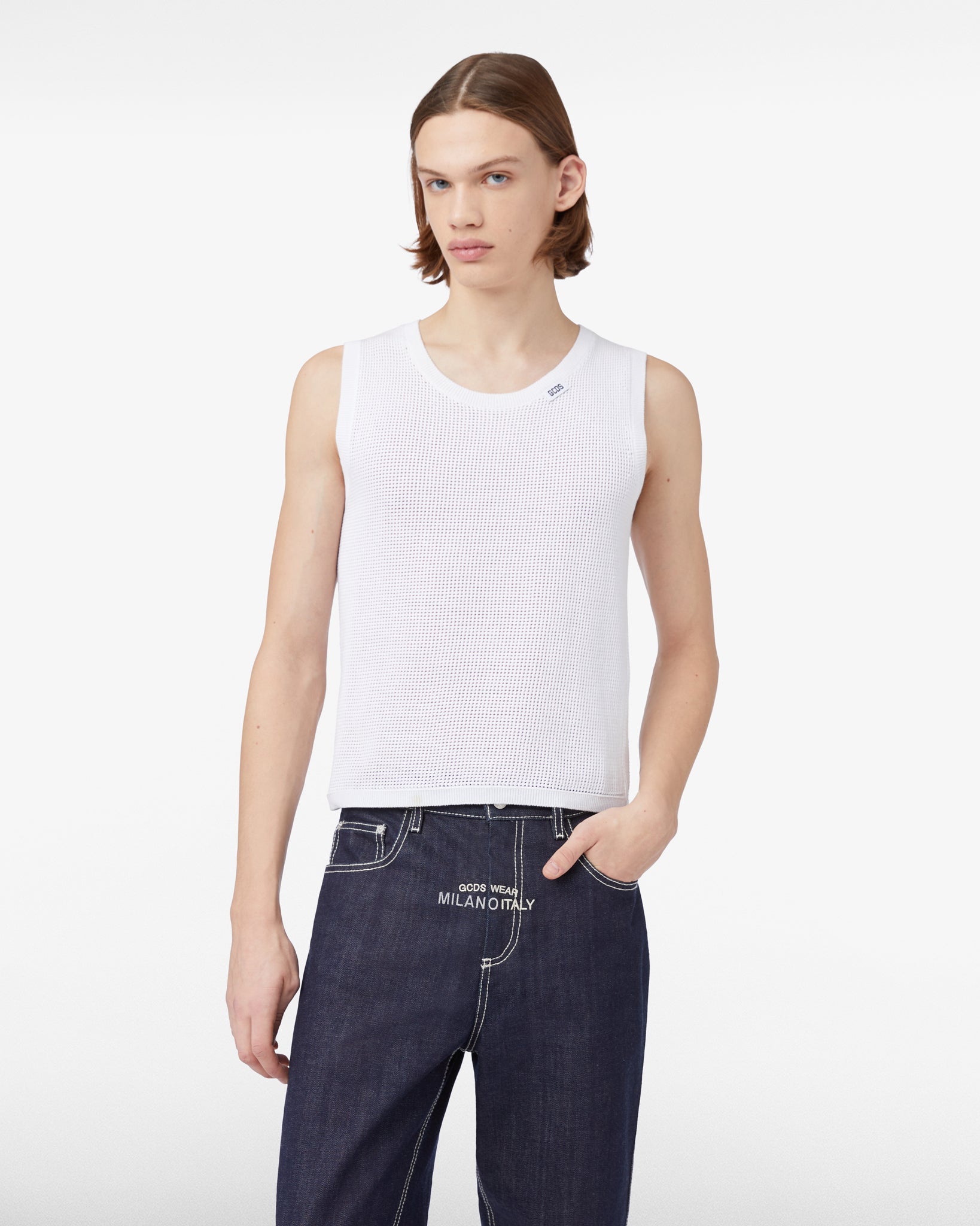 Cotton tank top with mesh work. Sleeveless with round neck and ribbed hems. Front label with GCDS logo in jacquard. Regular fit.