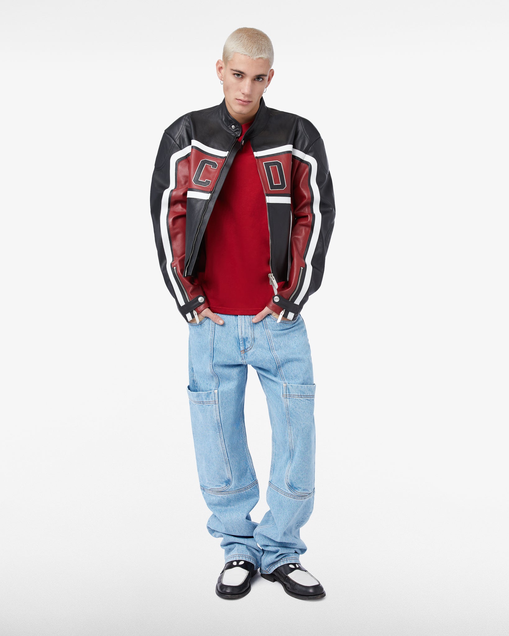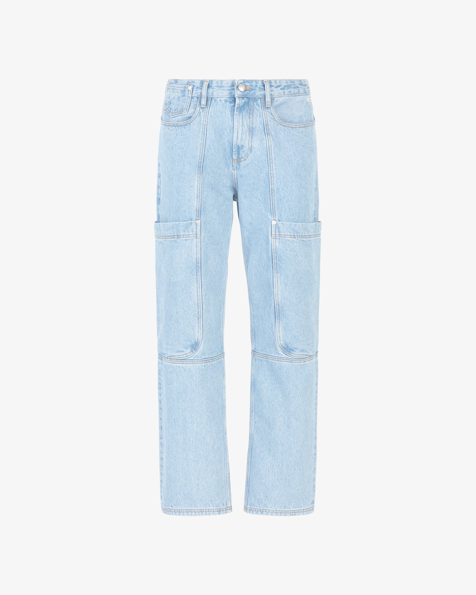 Straight fit pants in stone washed denim. Side patch pocket detail. Front zipper and stud button closure. "Gcds Wear" jacquard label and tobacco-colored contrast stitching.
