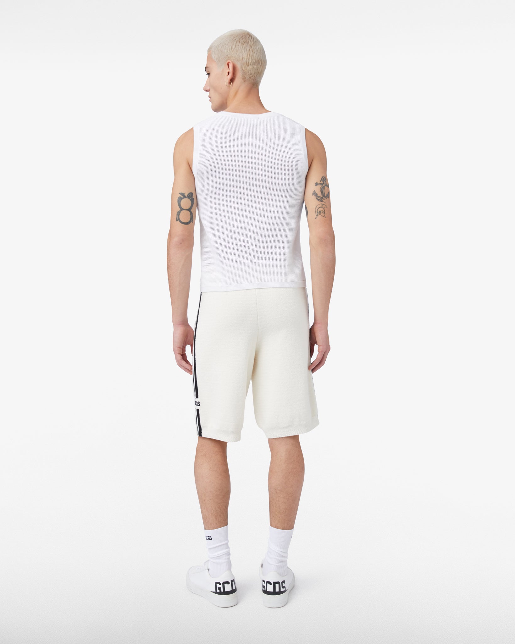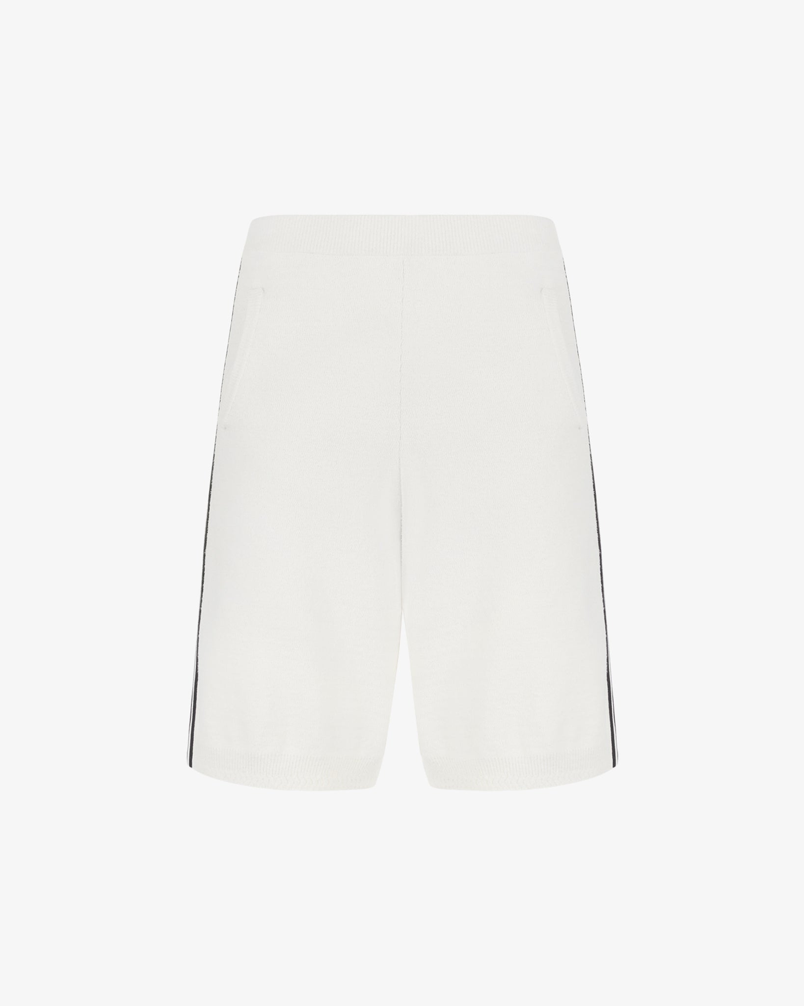 Knitted bermuda shorts made of cotton blend. Adjustable elastic waistband with tone-on-tone inner drawstring. Front welt pockets. Ribbed hems and contrasting striped piping. Regular fit.