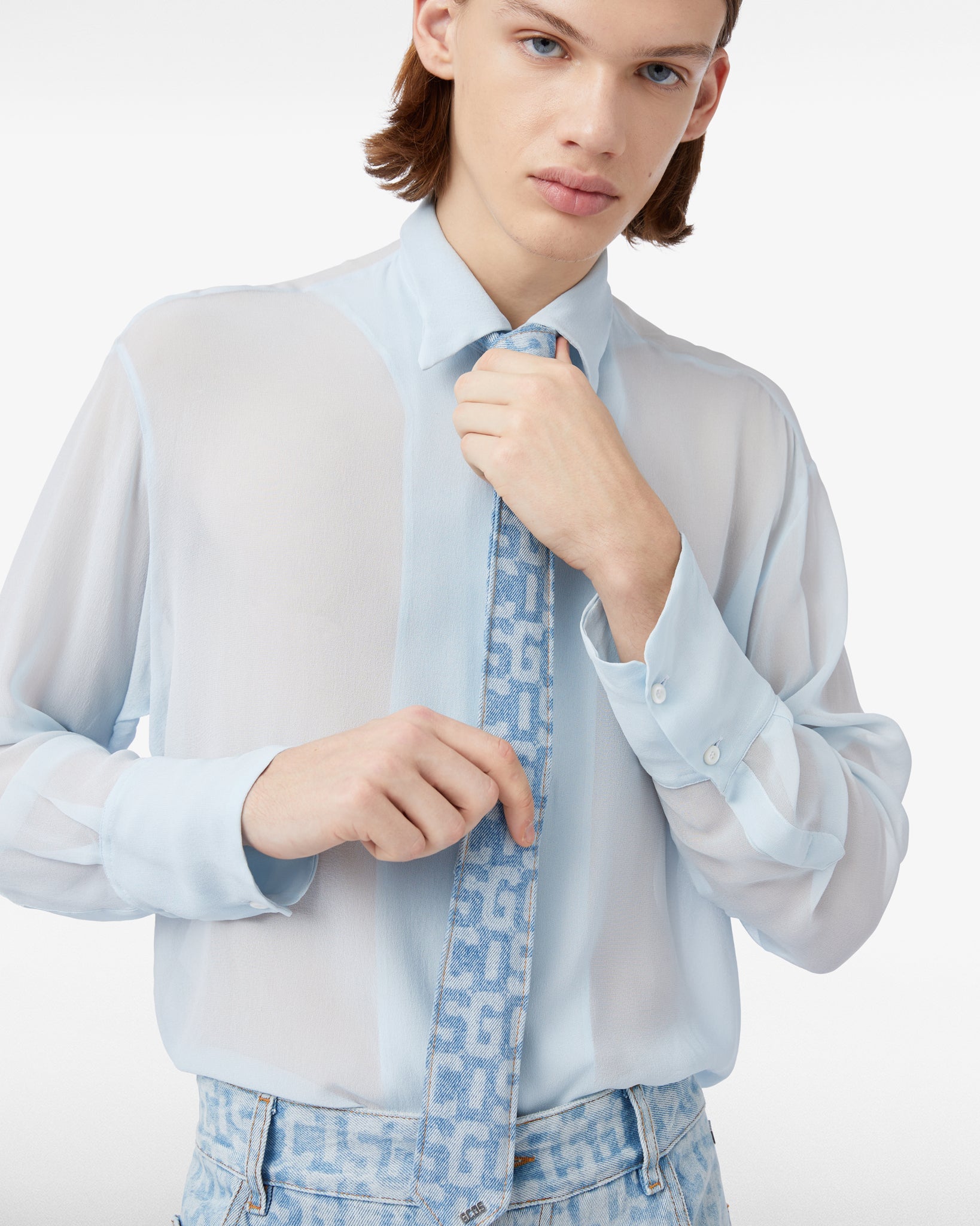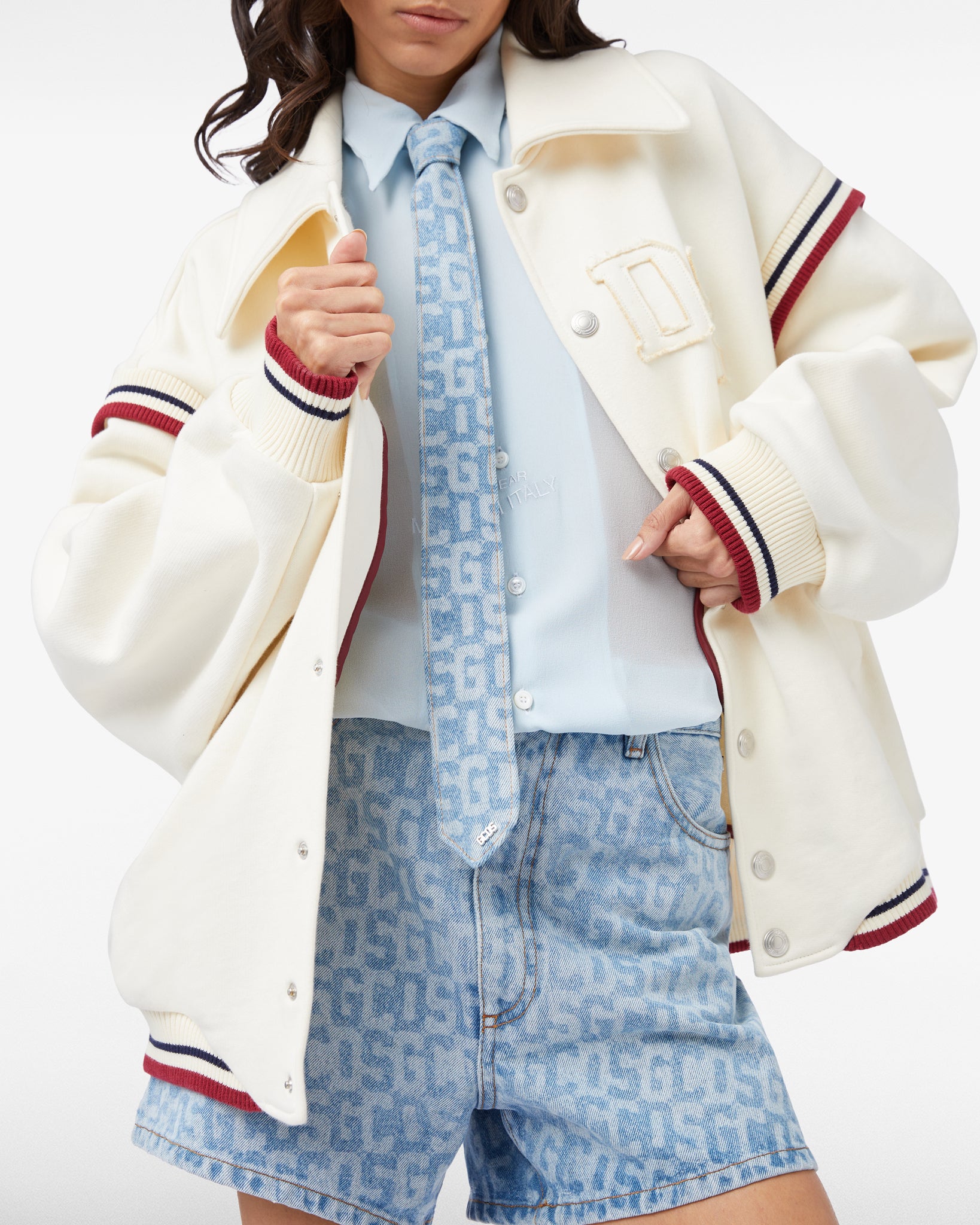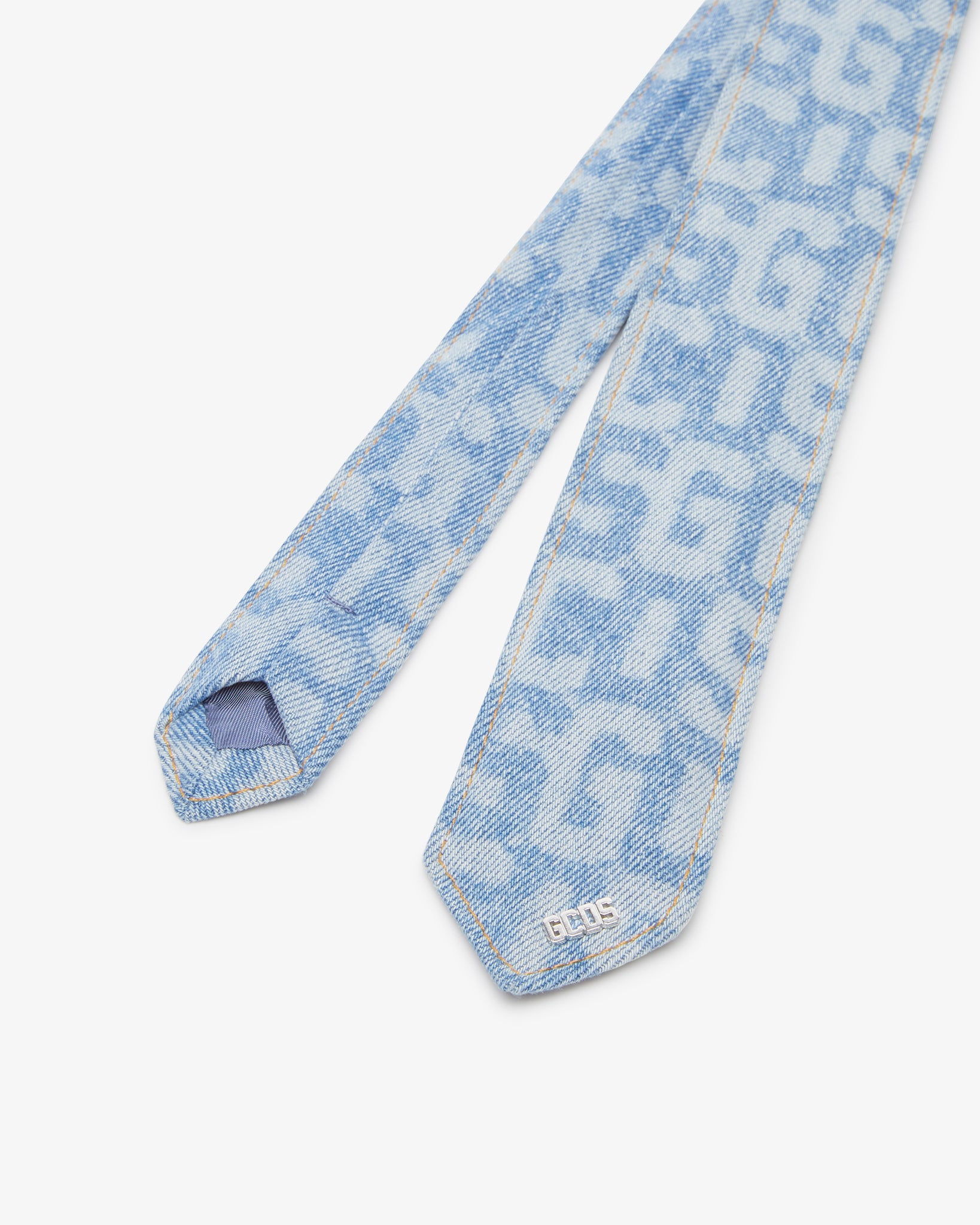 Laser-cut denim tie with Gcds Monogram pattern featuring a metallic logo detail on the front.