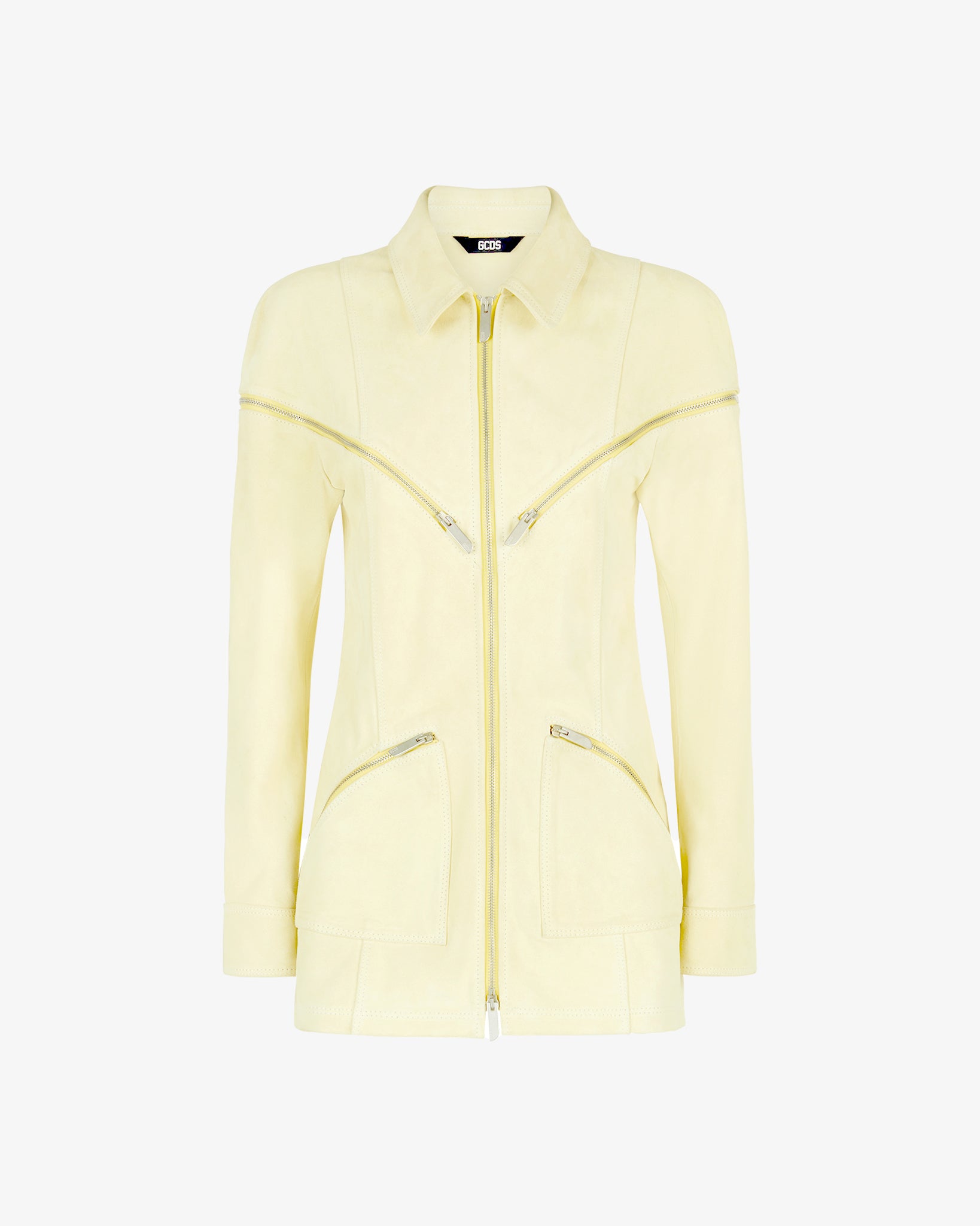 Fitted suede jacket with a notched collar and long sleeves. The jacket is complemented by zip details on the shoulders and pockets.