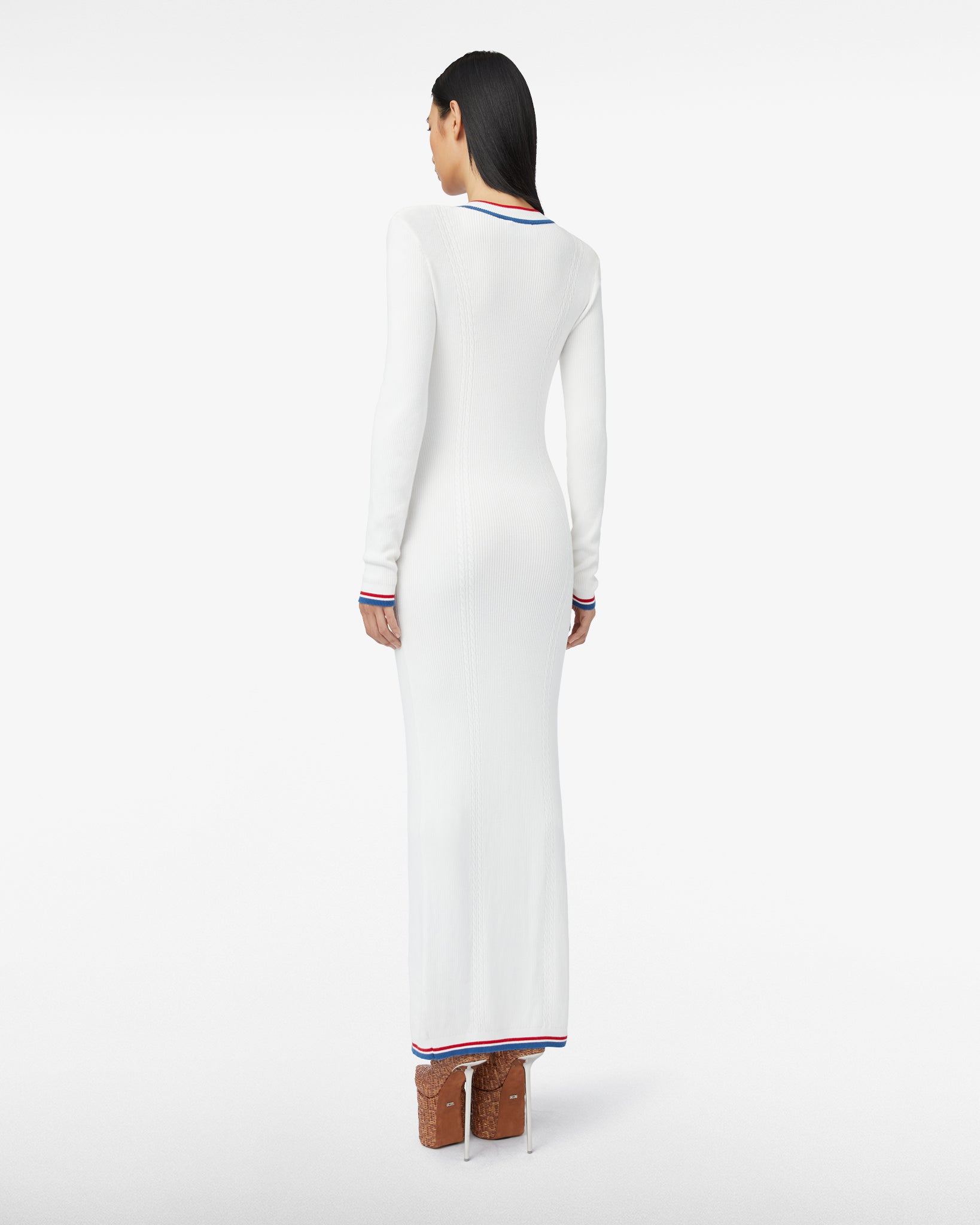 Fitted long dress with ribbed details. Round neck finished with two-tone ribbed trim . Inside shoulder straps, front slit and tone-on-tone coated button closure. Front welt pockets. Features a jacquard logo label on the neck.
