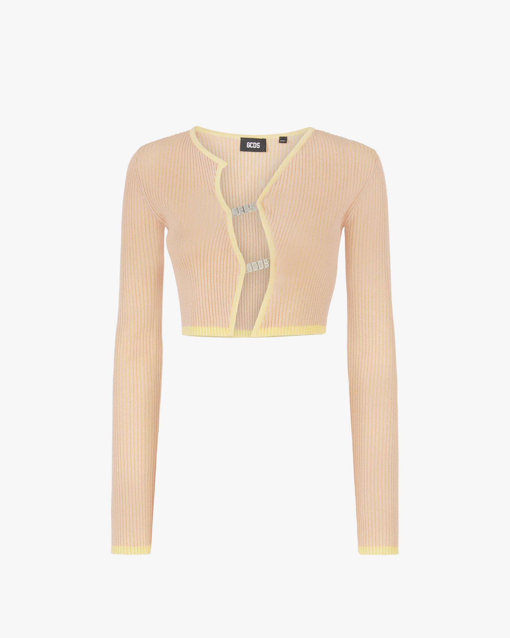Bicolor ribbed vanisé viscose mini cardigan. Contrast yellow trim. Front closure with two shiny nickel logo clips featuring a comma detail.
