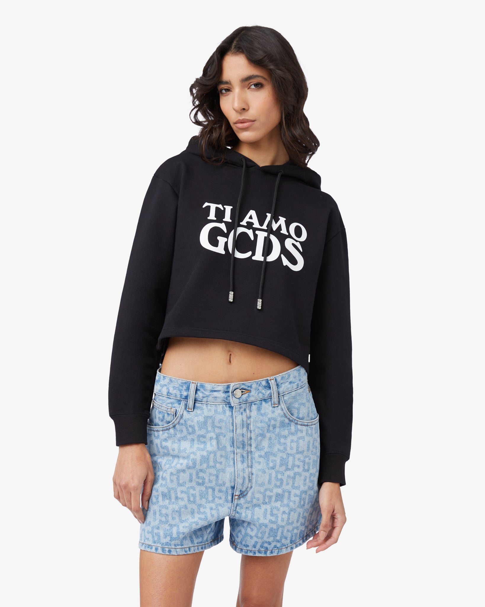 Crop hoodie made of cotton jersey. Adjustable hood with logoed laces and finecord. Contrasting "Ti Amo GCDS" print positioned on center front. Crop cut.