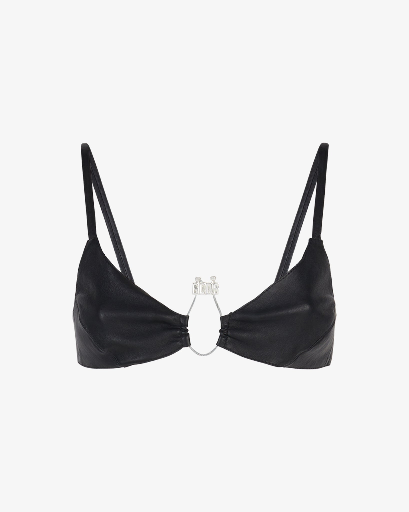 Black nappa leather mini bra with a logoed metallic Hoop detail at the center. Thin straps and logoed clip closure at the back.