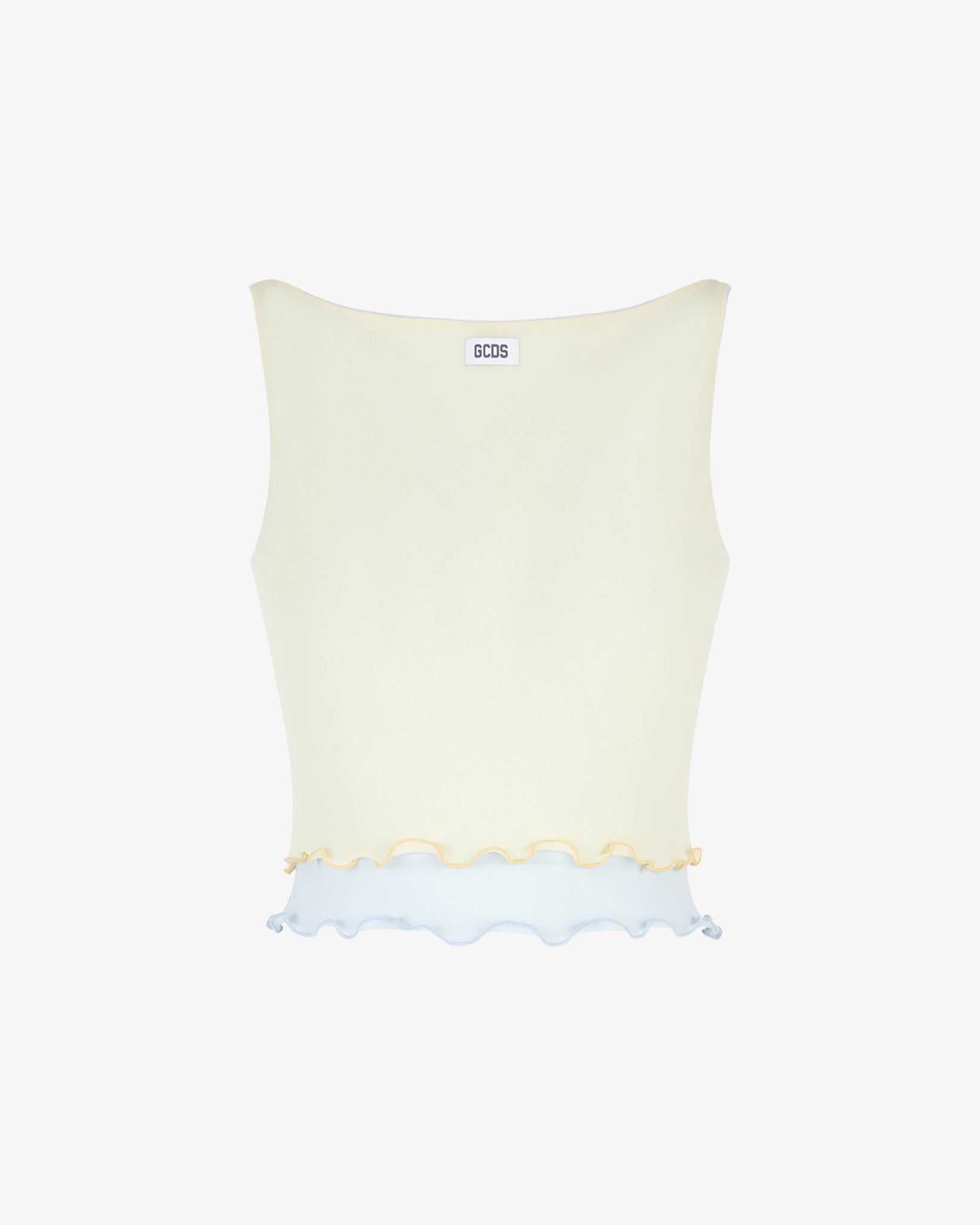 Sleeveless top in double-layer stretch tulle, featuring a vibrant combination of yellow and blue colors with a lettuce edge hem bottom. On the front, a Jacquard label with the logo is applied