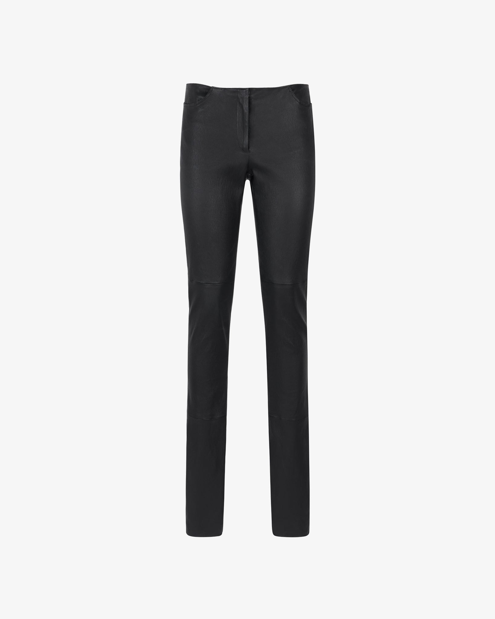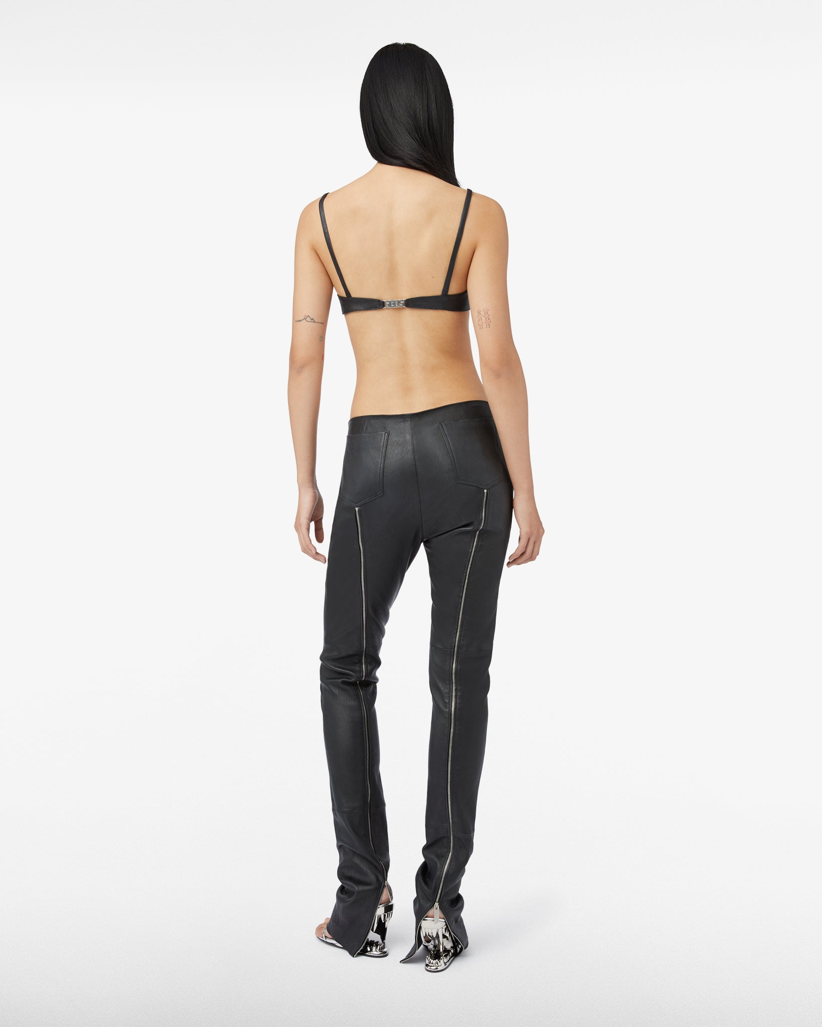 Low-rise, stretch nappa leather pants that, thanks to the semi-elastic fabric adapting to the body's shapes, offer a comfortable and shaping fit. The distinctive feature of these pants lies in the rear zippers placed along the entire length of the leg, adding a touch of originality to the design.