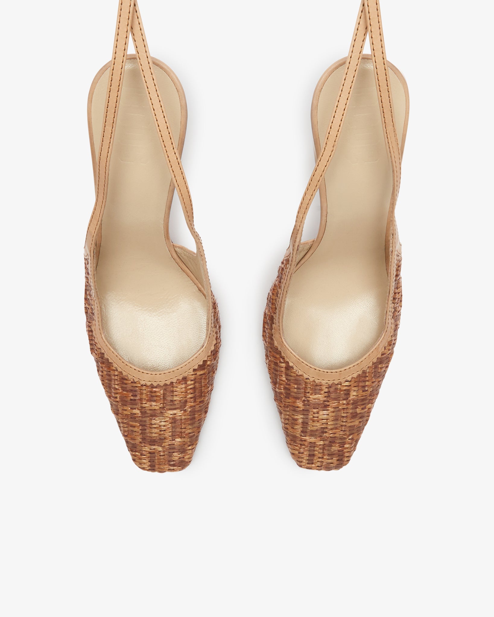 Square toe slingback made of woven raffia with embossed GCDS Monogram pattern with cowhide trim and piping. Featuring a square pointed toe and a cowhide ankle strap. Heel with metalized "GCDS Cube" chain module.