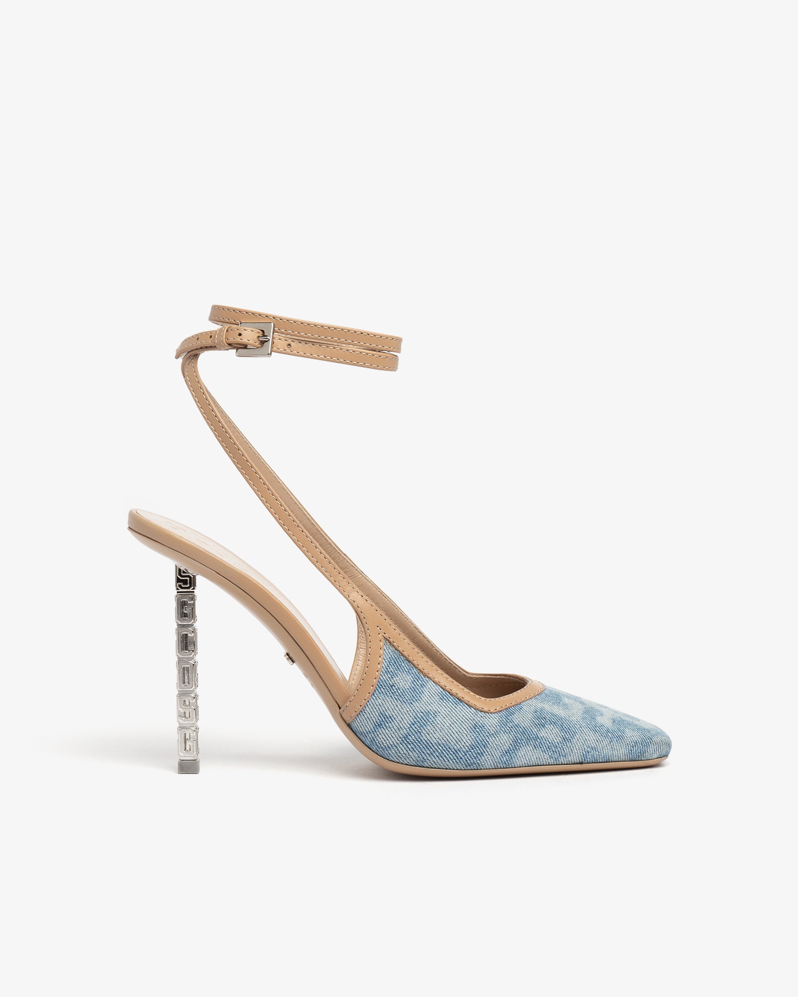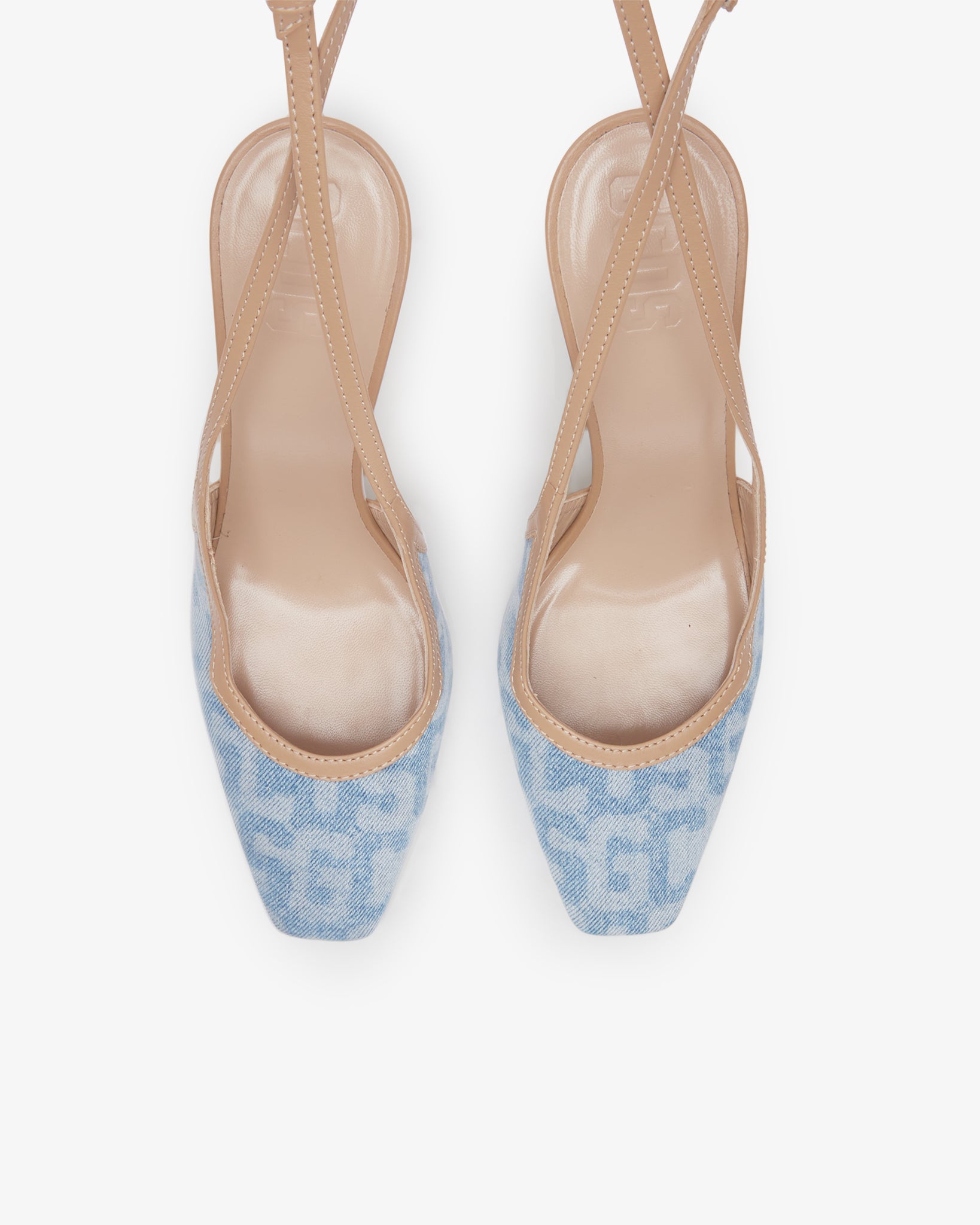 Square toe slingbacks made of laser-embossed GCDS Monogram Denim canvas with cowhide trim and piping. Featuring a square pointed toe and a cowhide ankle strap. Heel with metalized "GCDS Cube" chain module.