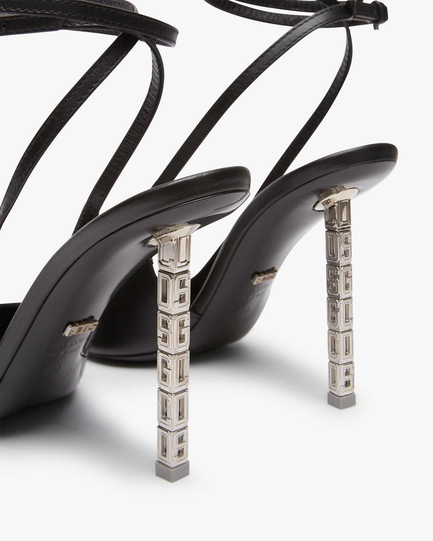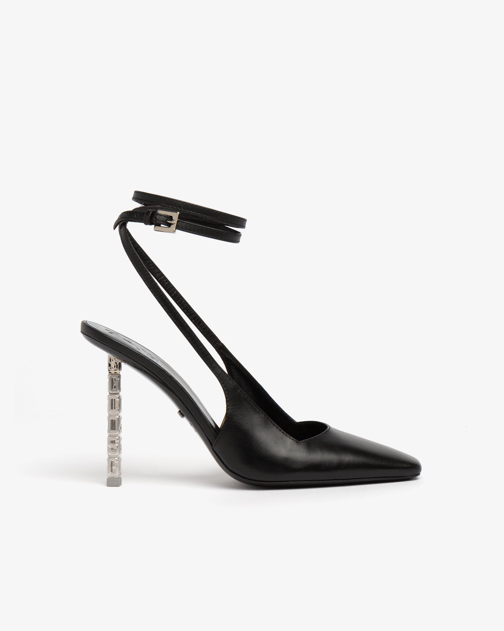 Square toe slingback made of leather with matching trim and piping. Characterised by a squared neckline on the instep and a cowhide ankle strap. Shaft heel with metallised "GCDS Cube" chain module.