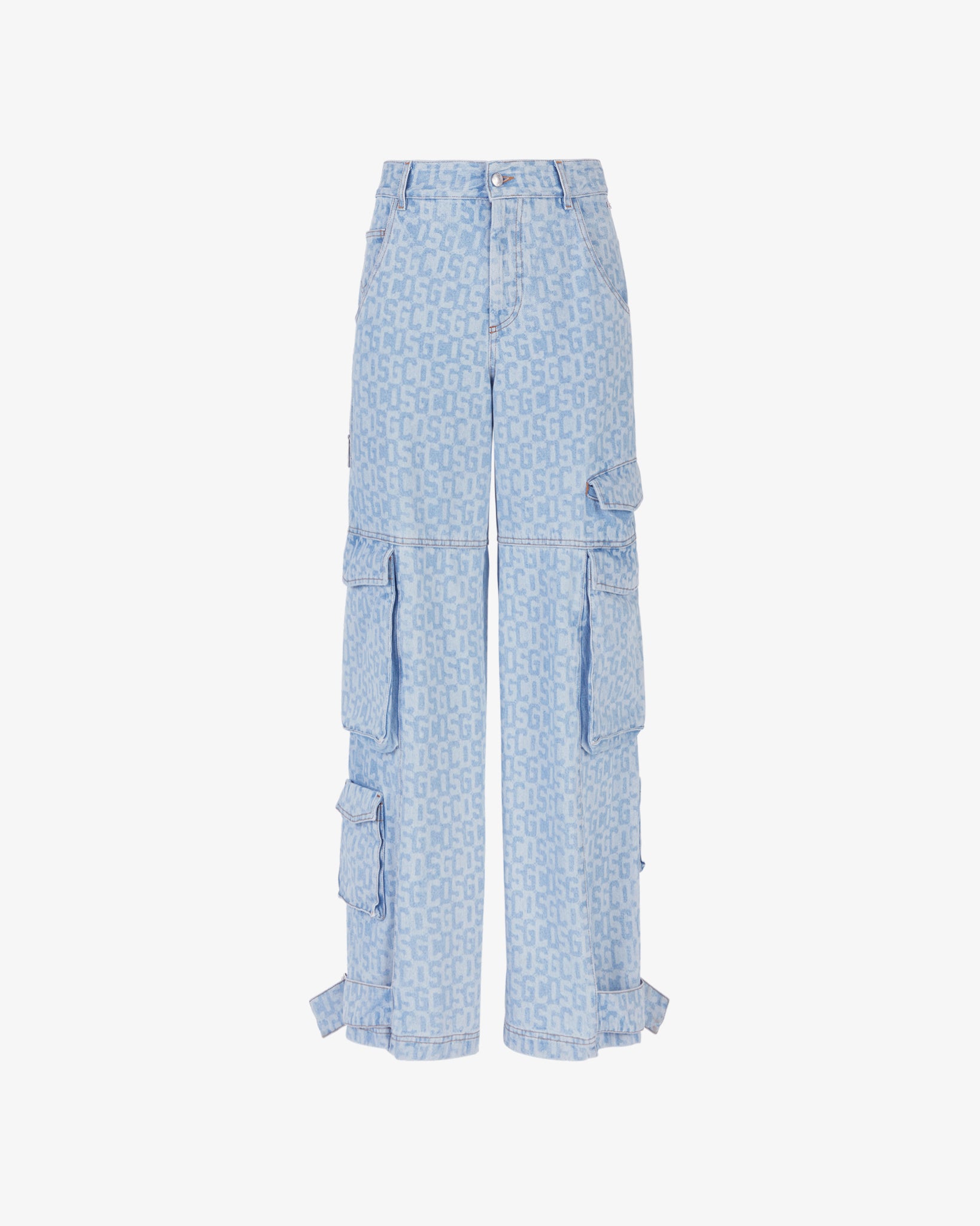 Ultra-cargo pants in laser-embossed denim with Gcds Monogram pattern and tobacco-colored contrast stitching. Side cargo pockets and logoed back patch. Front zipper and stud button closure. Adjustable bottom with buckles and leather hammer loop at back.
