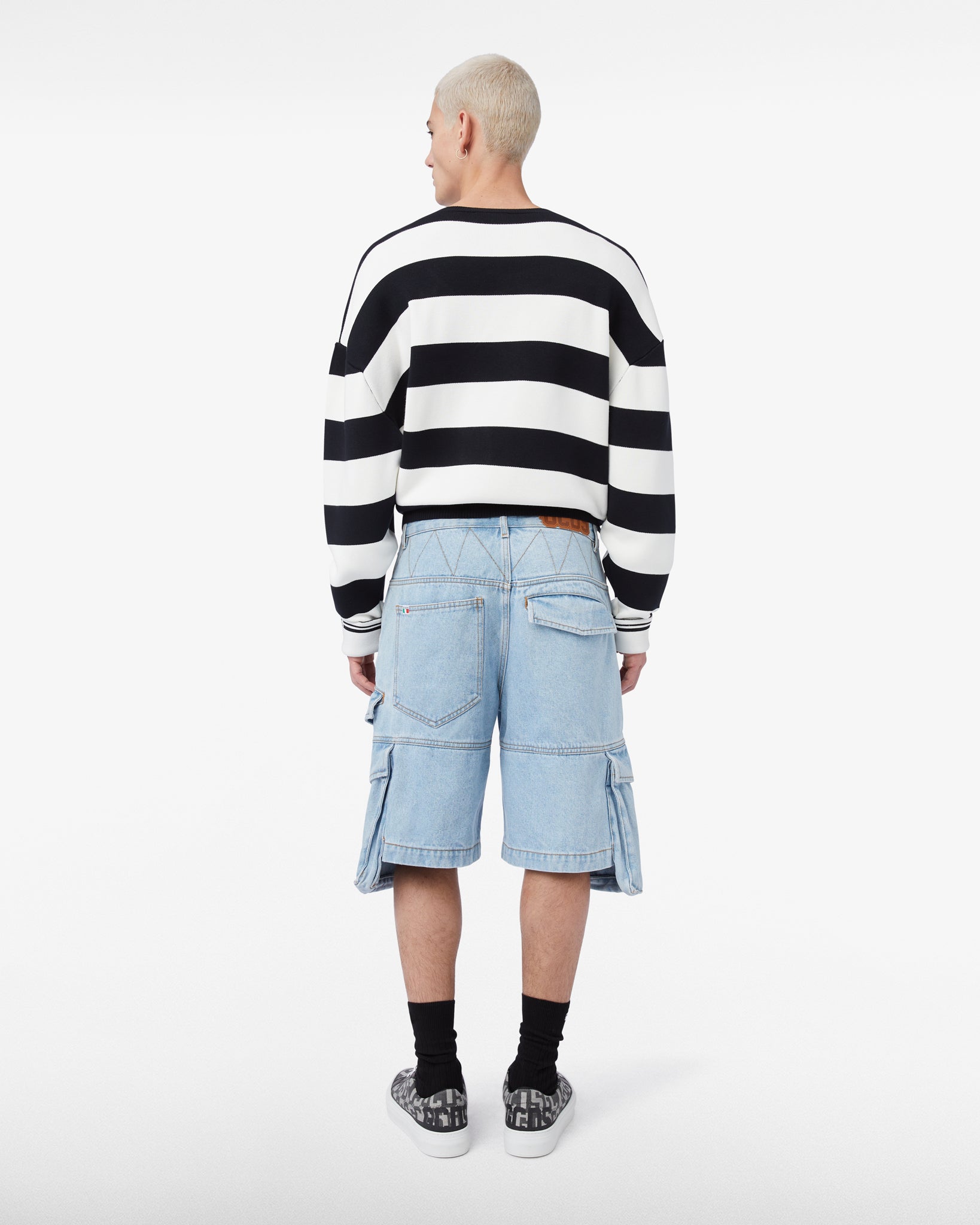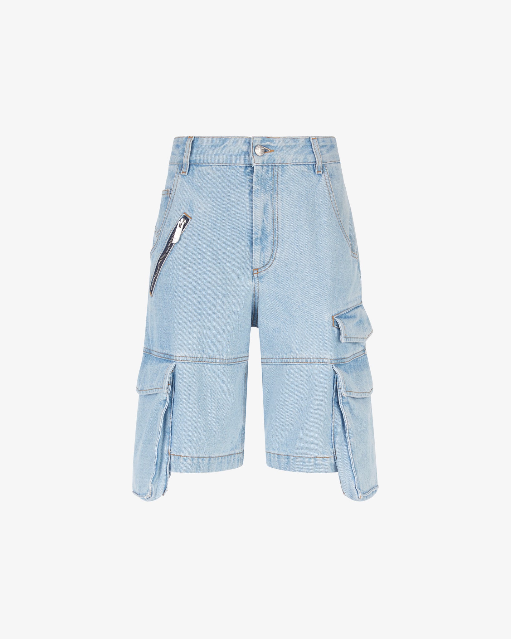 Ultracargo bermuda shorts in stonewashed denim. Front zipper pocket and side patch cargo pocket detail. Front zipper and stud button closure. Tobacco-colored contrast stitching.