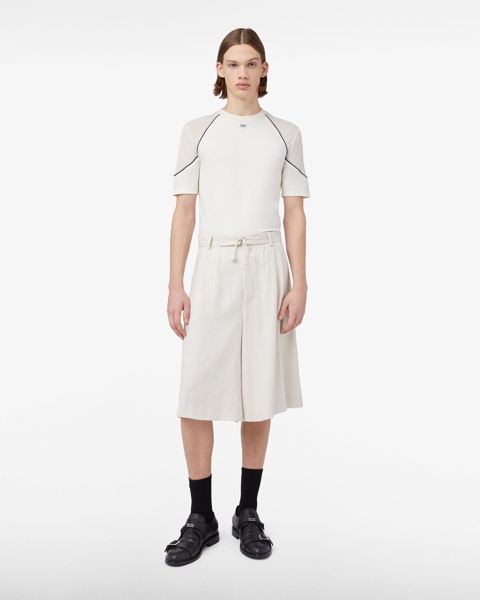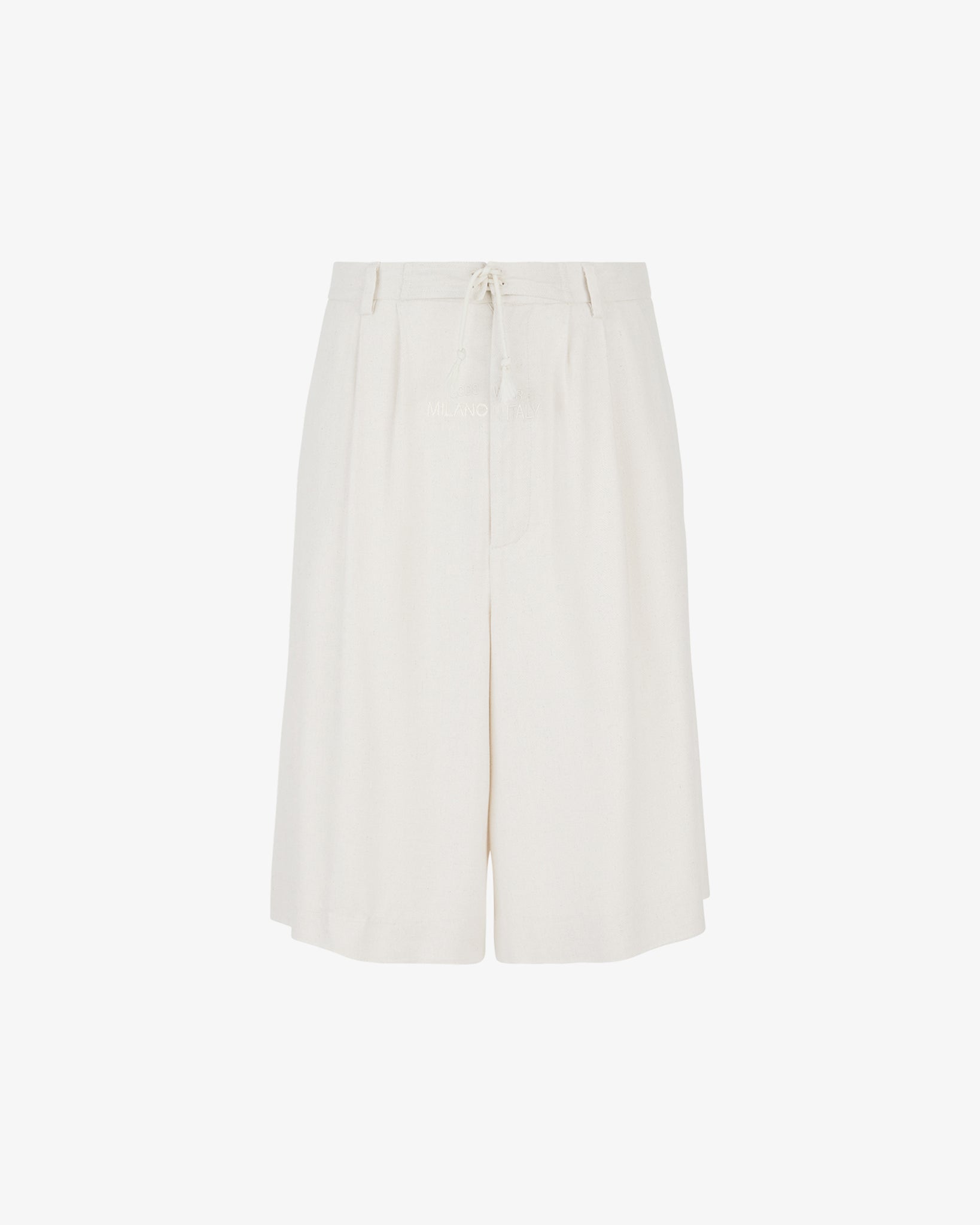 Loose-fitting Bermuda shorts made of linen-viscose blend. Adjustable elastic waistband with drawstring. Central tone-on-tone "Gcds Wear" embroidery and back patch pocket detail complete the garment.