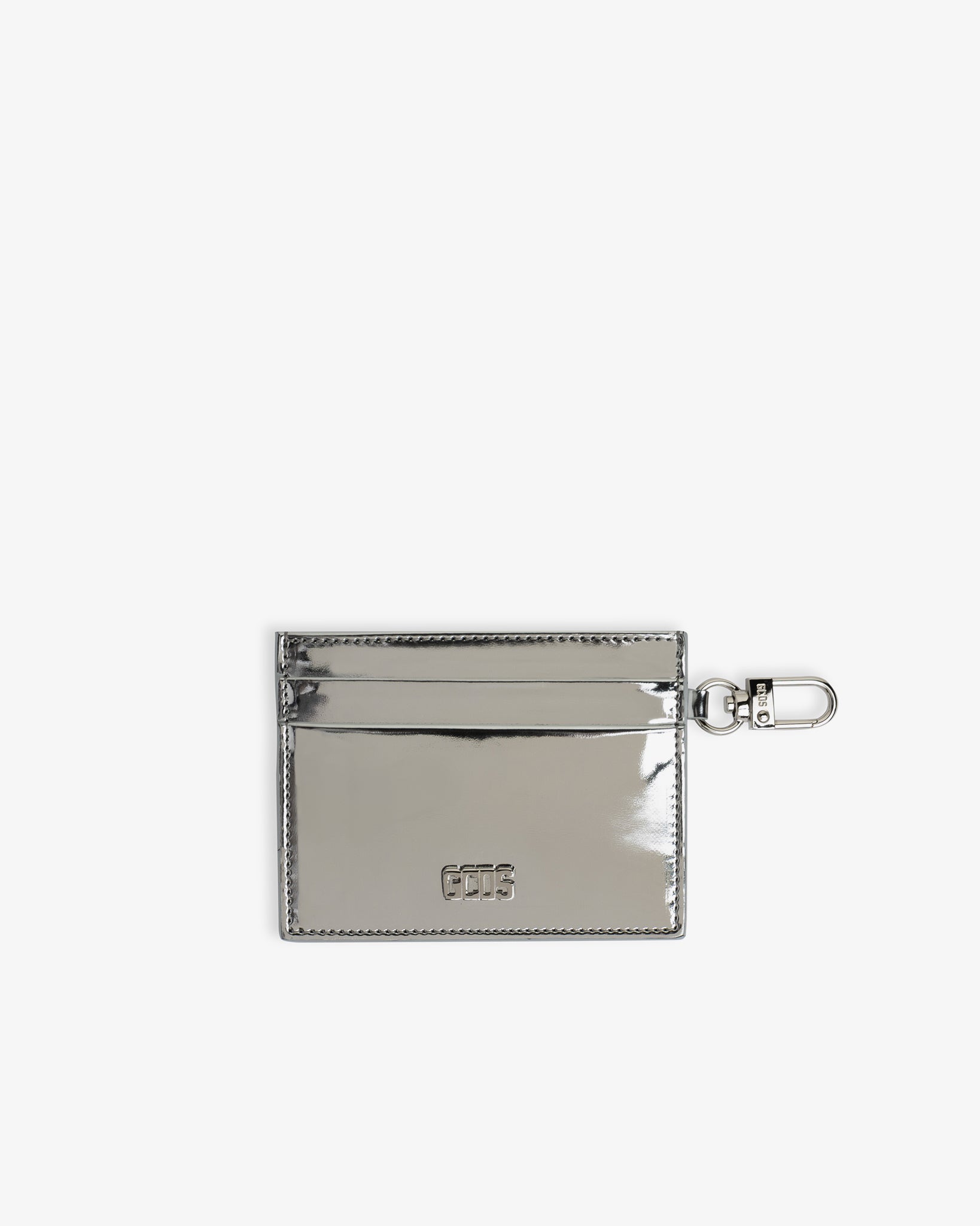 Silver laminated pocket card holder with tone-on-tone stitching. It features a metallic GCDS logo plaque. Three card compartments and a logoed keychain hoop complete the accessory.