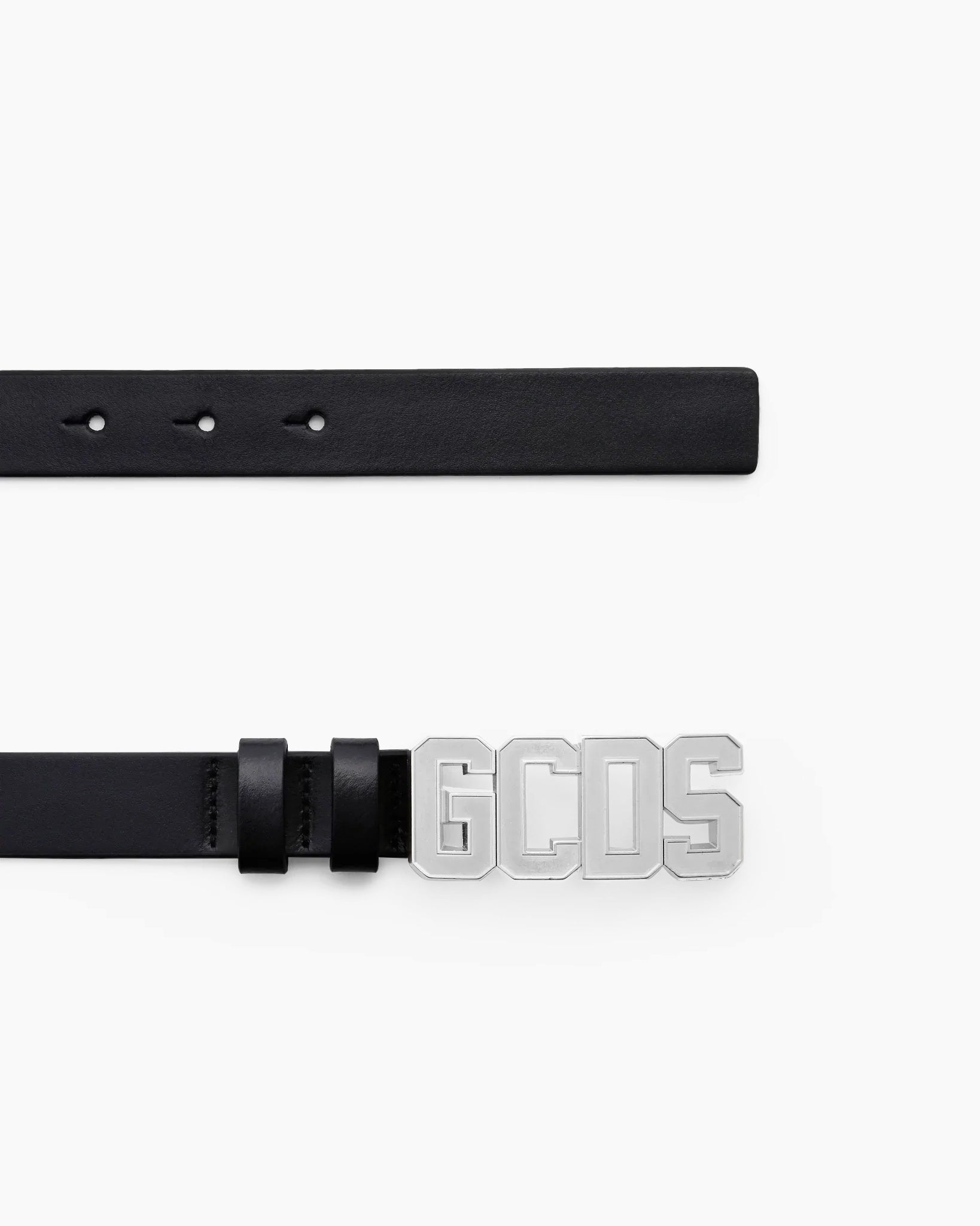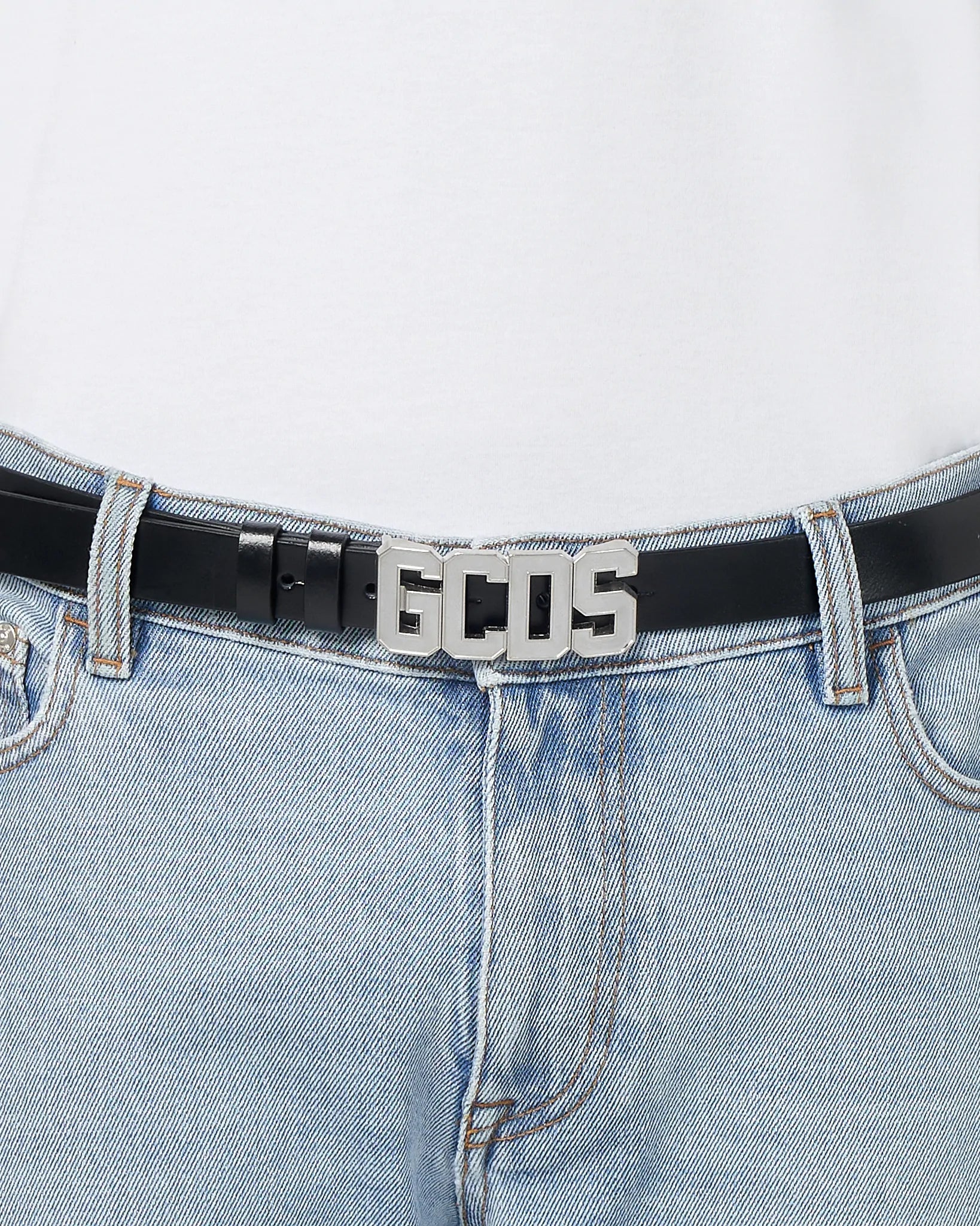 Leather belt with loops. Bridge and pin buckle closure decorated with a golden GCDS logo. Regenerated leather interior.