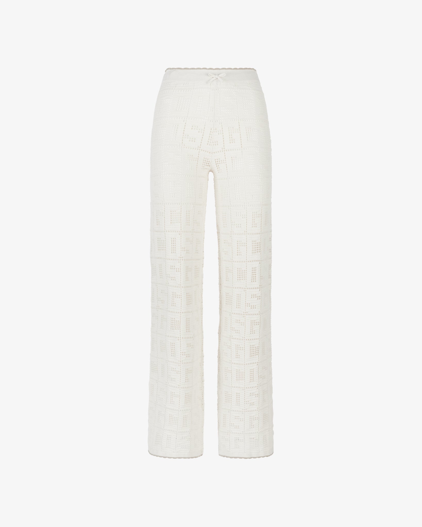 Cotton trousers with GCDS monogram crochet see-through effect. Drawstring waistband. Contrasting cloud stitch trim. Side slits. Wide fit.