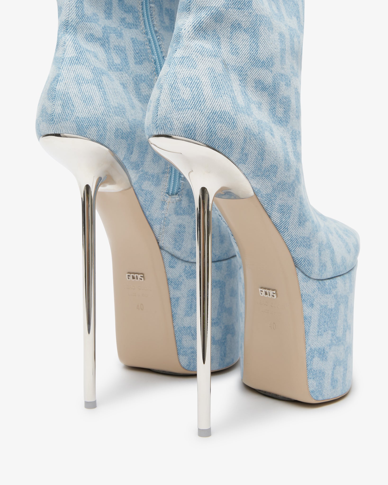 Fitted below the knee boot with platform, characterized by a protruding platform and a vertiginous pointed chrome silver heel. Upper and platform covered in laser-cut GCDS Monogram Denim canvas. Internal zip with leather zip puller.