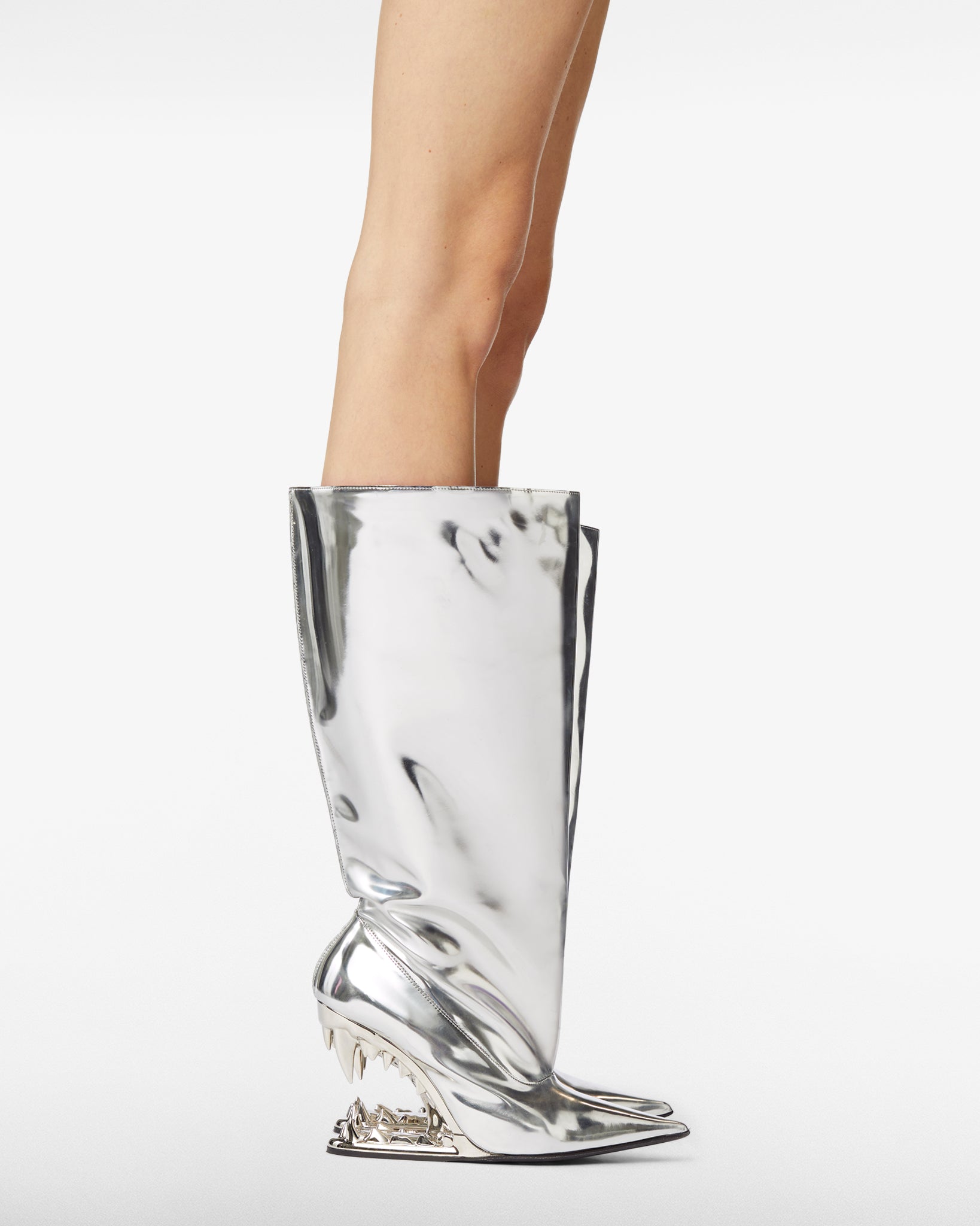 Wide boots featuring the iconic Morso heel, made from silver laminated material with a mirror finish. The leather insole has a hot-pressed GCDS logo stamped.