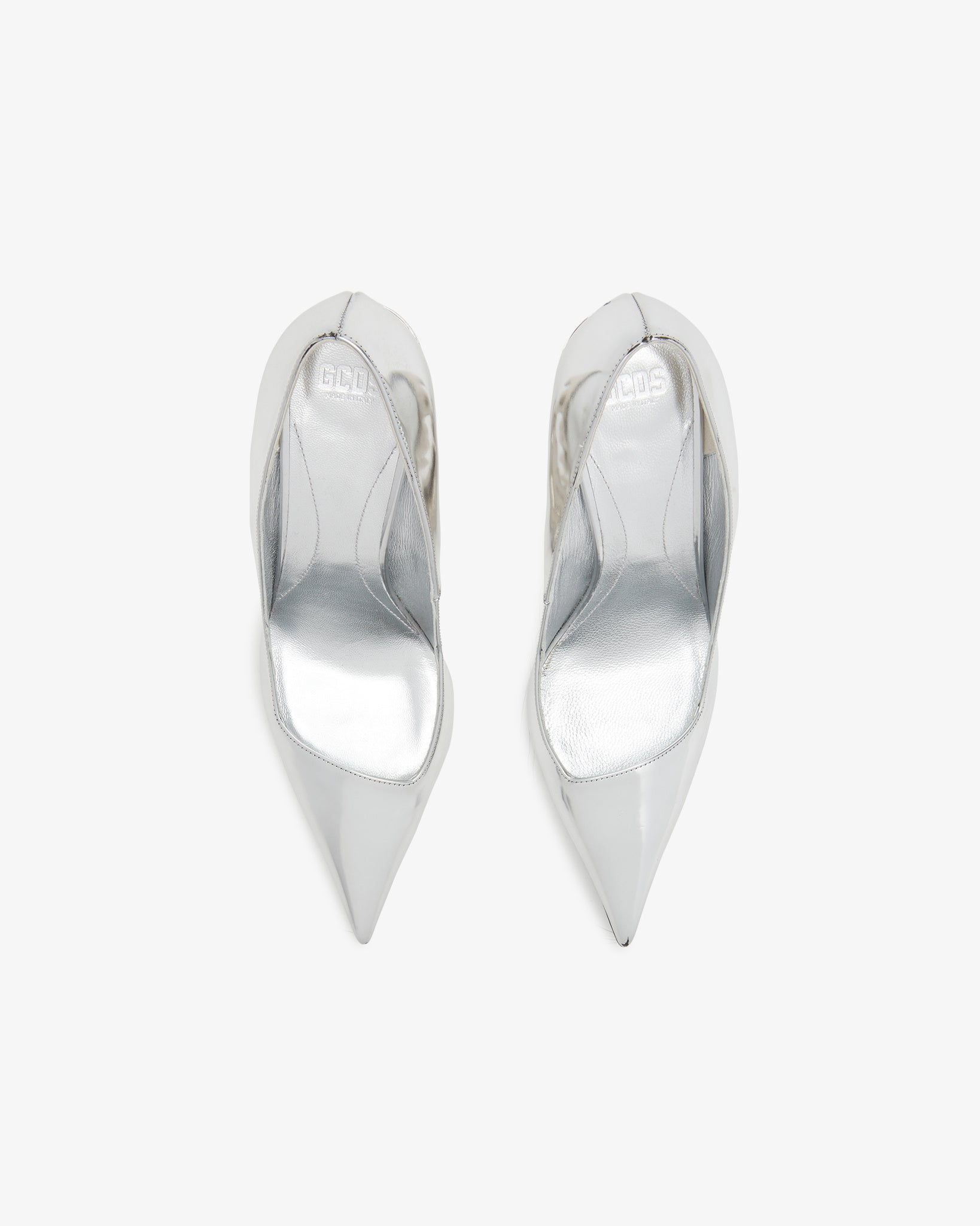 Leather laminated pumps featuring the iconic Morso heel in silver, and characterized by an asymmetrical cut at the front with mirror finish. The leather insole has a hot-pressed GCDS logo stamped. Pointed toe.