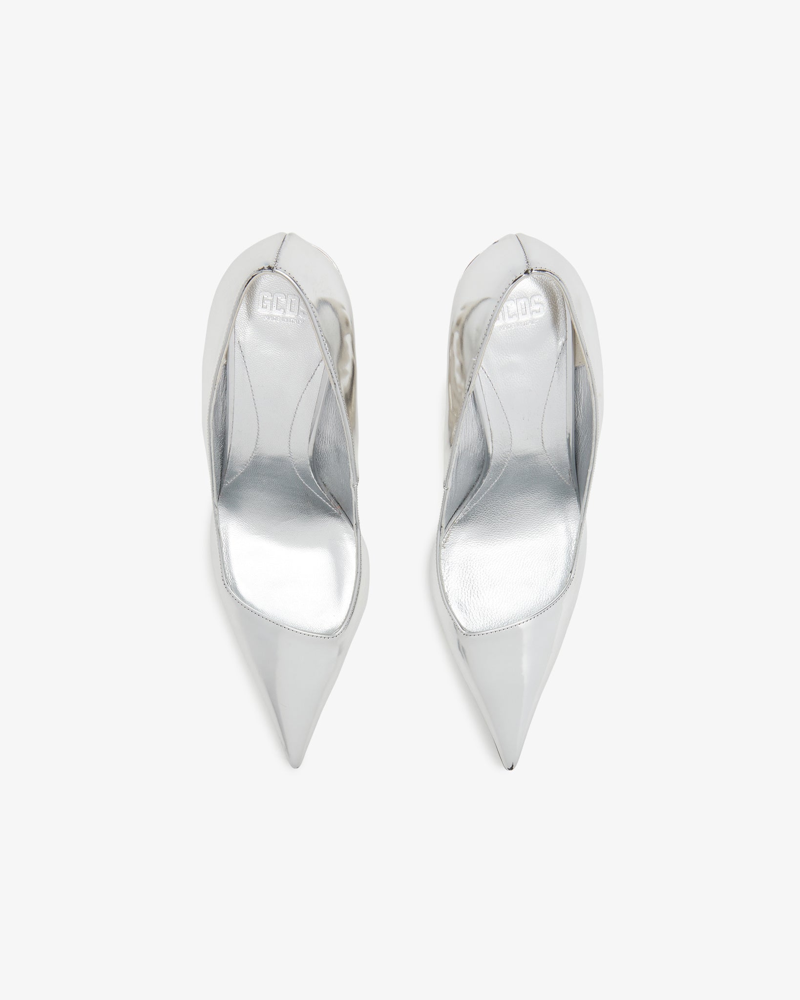 Leather laminated pumps featuring the iconic Morso heel in gold, and characterized by an asymmetrical cut at the front with mirror finish. The leather insole has a hot-pressed GCDS logo stamped. Pointed toe.