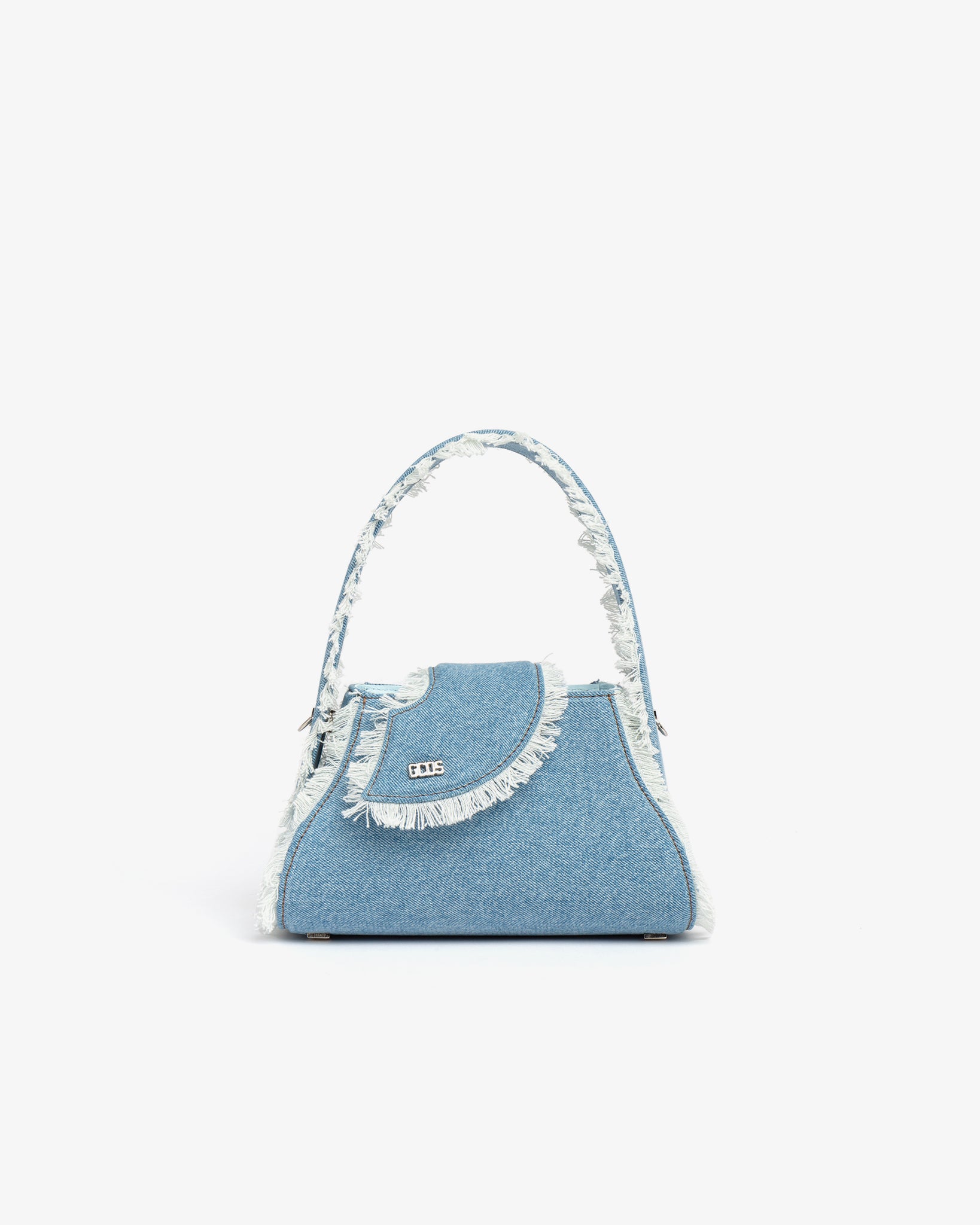 Comma bag in denim, small size, with a distinctive flared shape. Asymmetrical curved flap with frayed profiles and shiny nickel GCDS logo on the end. Fixed handle with logoed metal details equipped with d rings that allow the application of the adjustable service strap. Inside, ecru jacquard logo lining and asymmetrical card pocket. Bottom with 4 polished nickel logo feet.