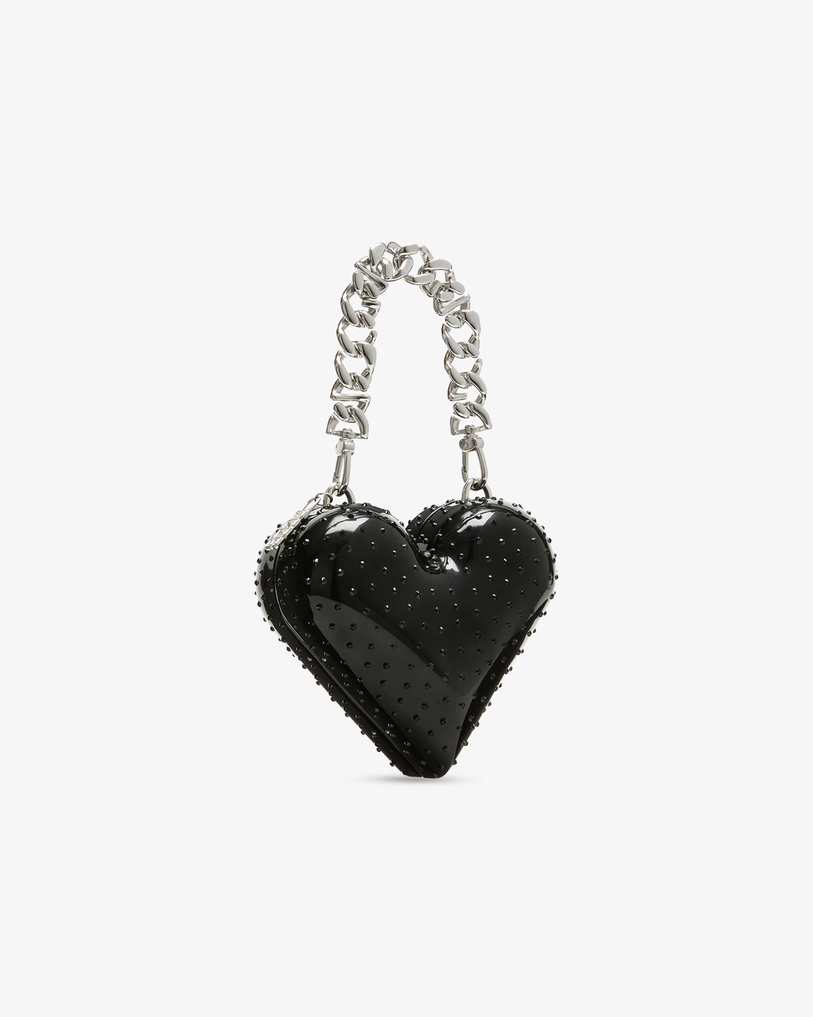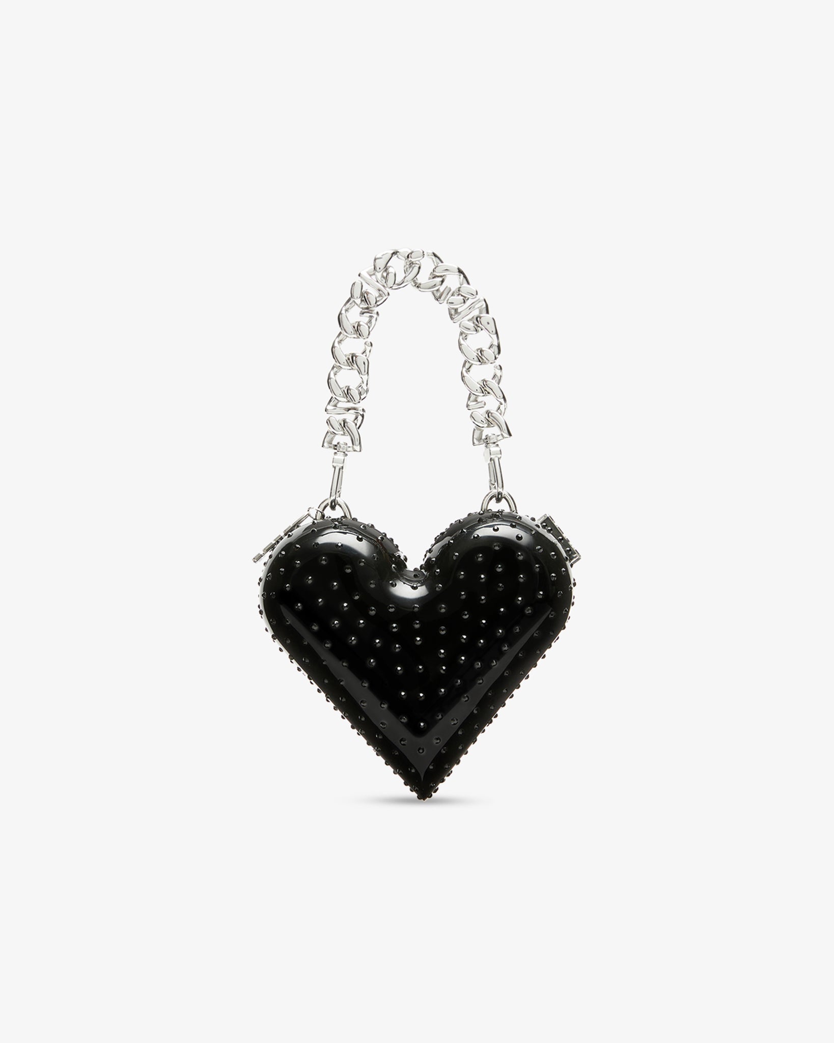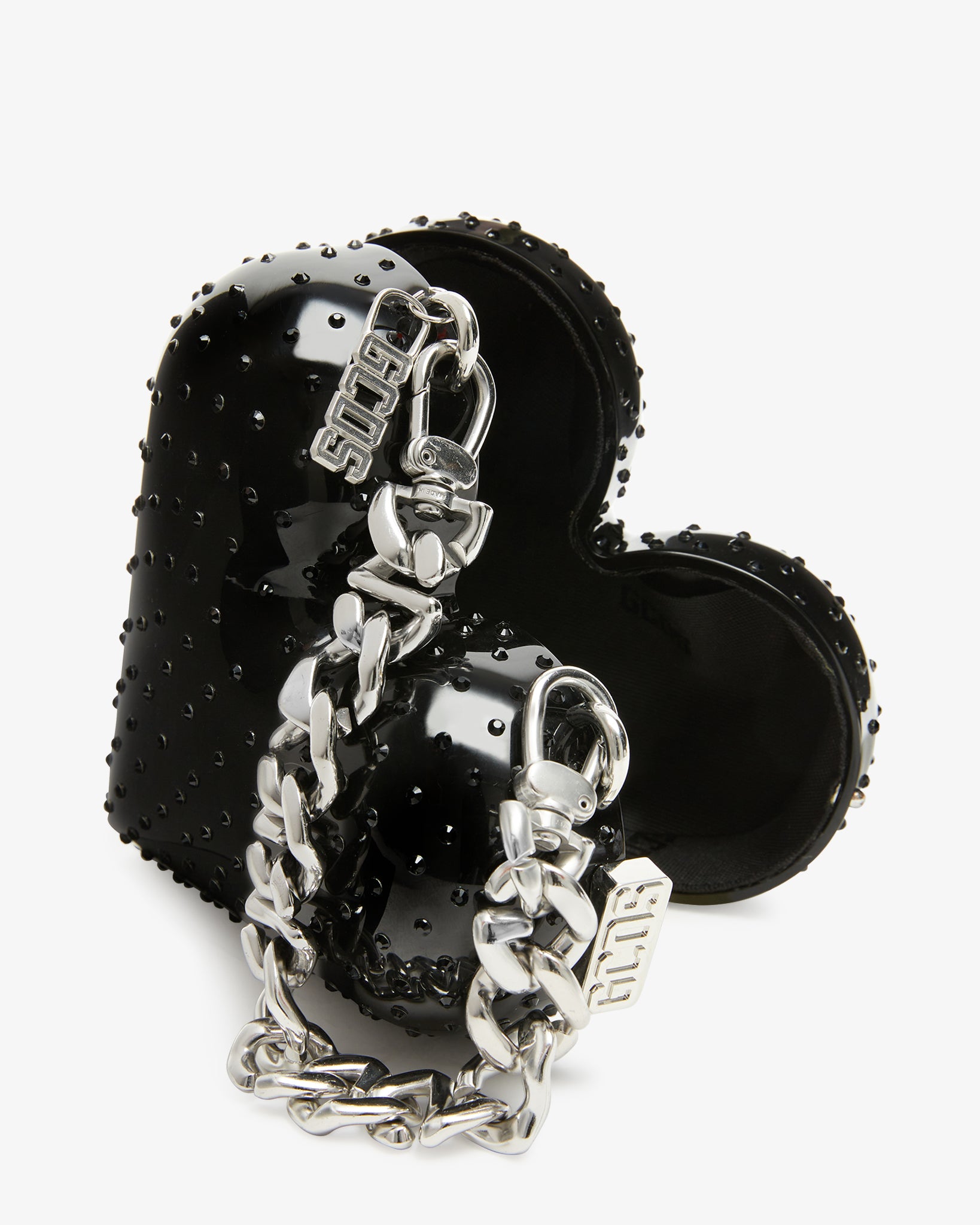 Iconic Heart bag made of shiny polyester resin on all-over set rhinestones and clip closure. Handle with GCDS logo chain in shiny nickel-silver. Interior features jacquard lining with leather heart shaped pocket and hot-stamped logo.