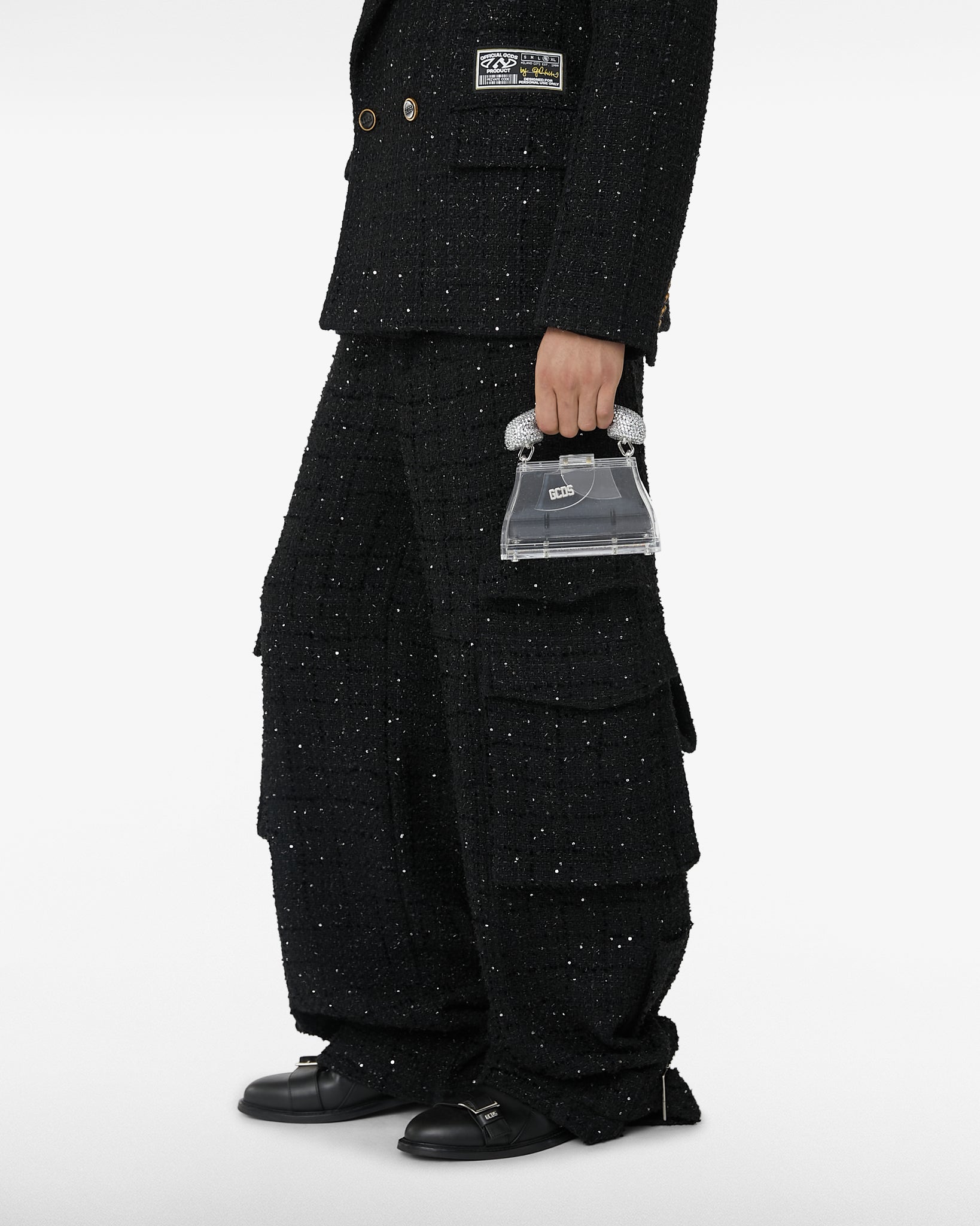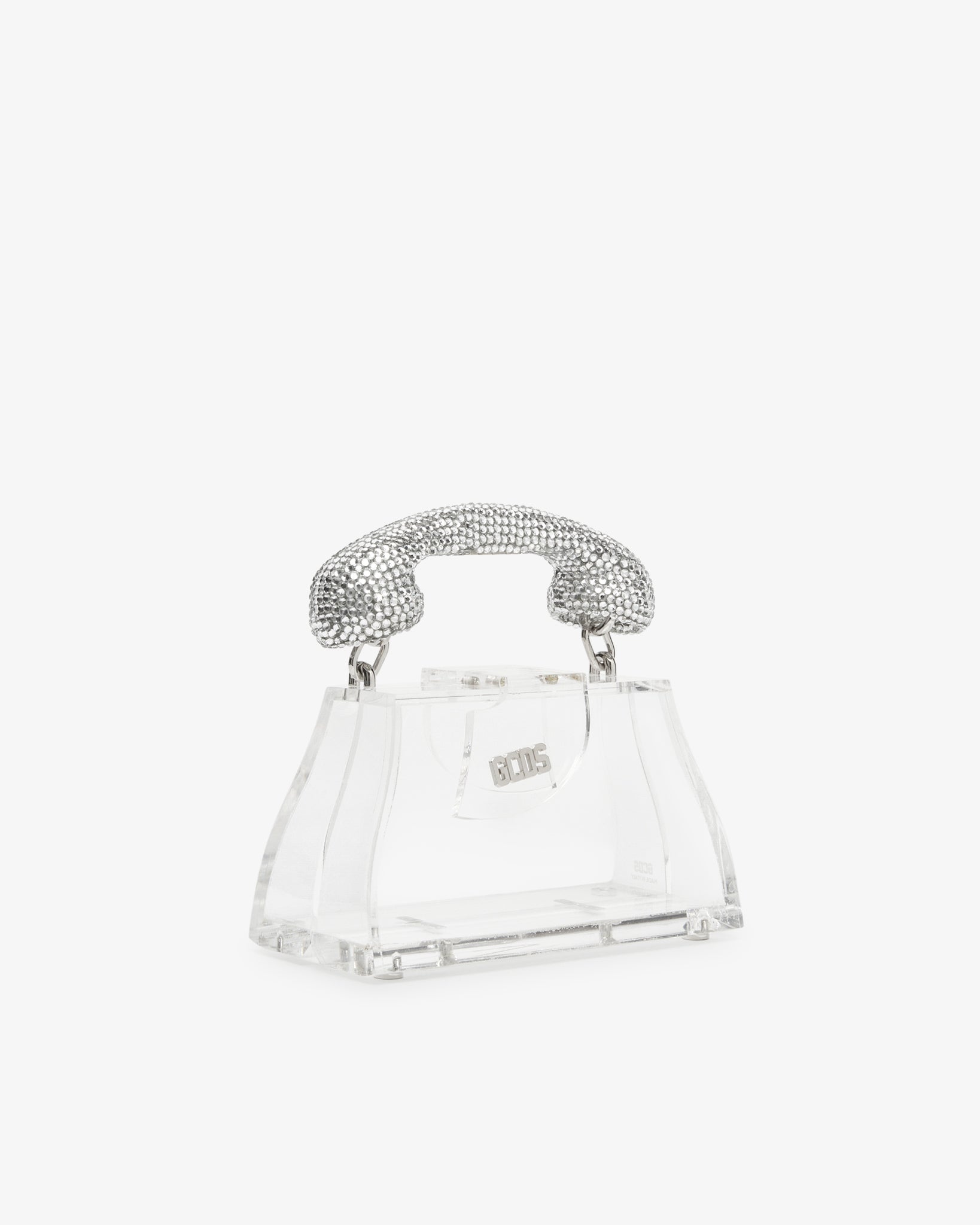 Call-Me Comma bag, small size, made of acrylic with distinctive flared shape. Magnetic snap closure. Characterized by the asymmetrical curved flap made of acetate that simulates the iconic leather bag opening. The distinctive feature of the bag is the cornet-shaped handle full pavé of hand-applied rhinestones.