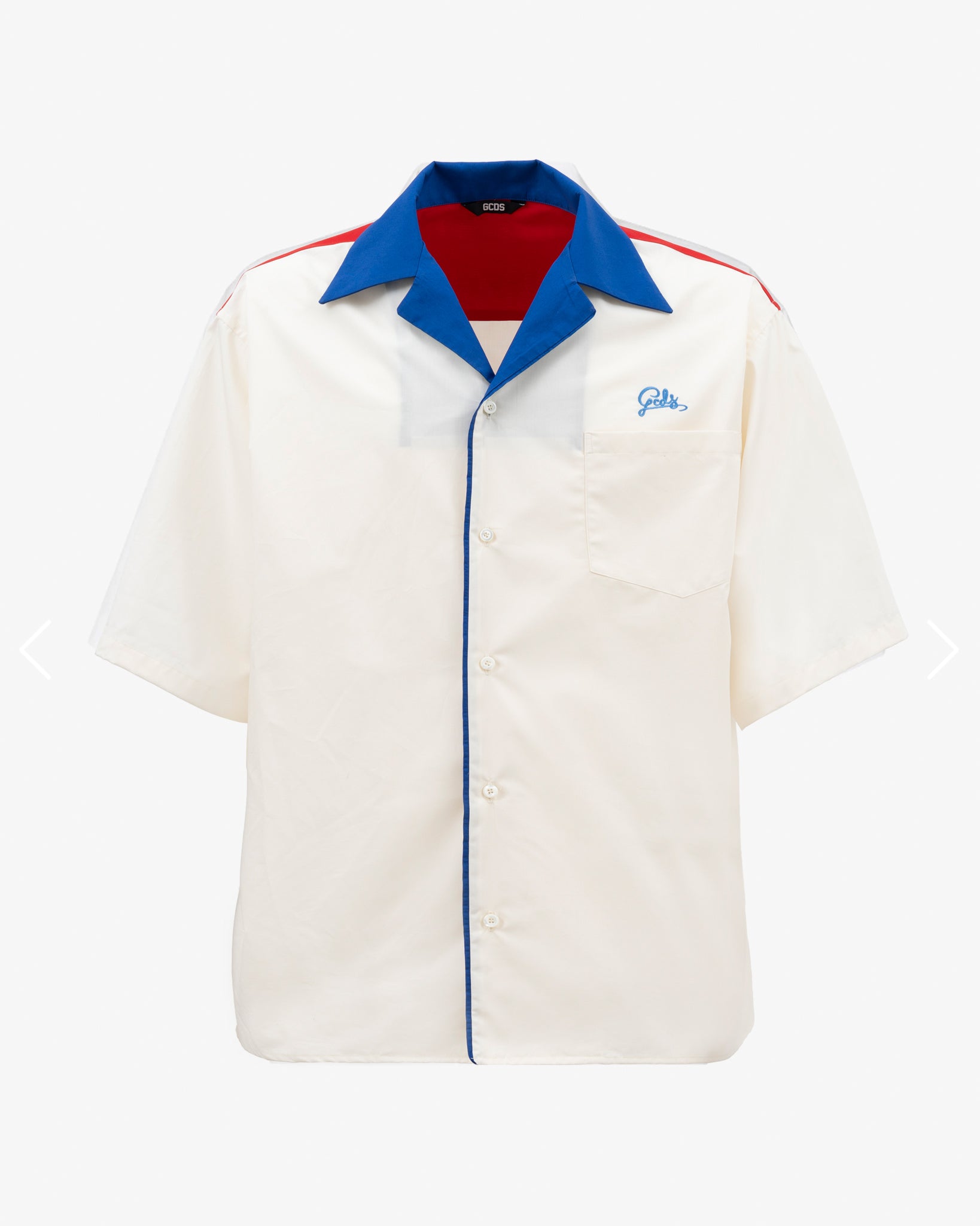 GCDS x Pepsi limited edition bowling shirt features a three tone design, a back Pepsi logo print in red and blue collar. This shirt is designed to have a loose fit.