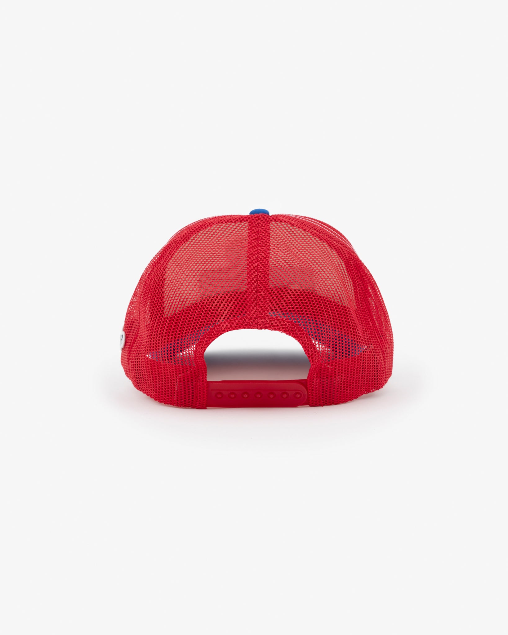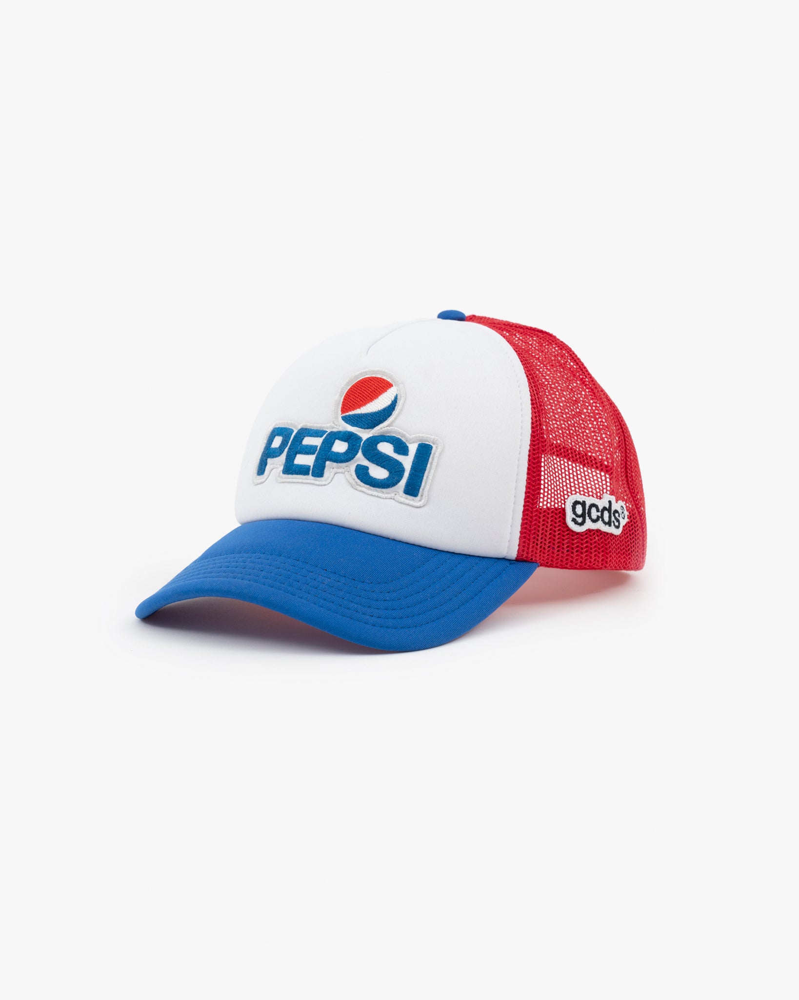 GCDS x Pepsi limited-edition Trucker hat, featuring blue/white cap and visor, mesh back and back tab equipped with adjustment snap .