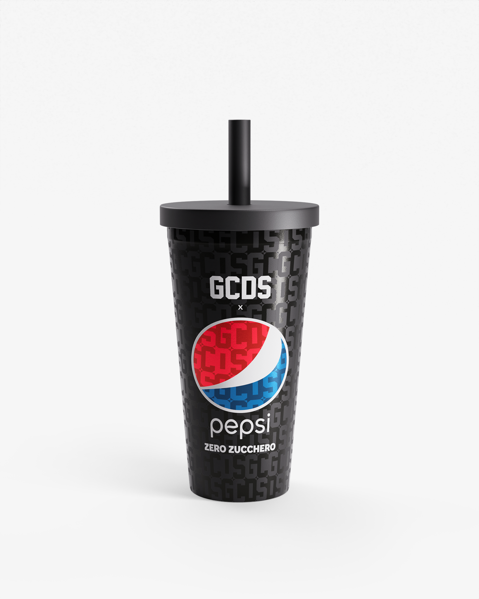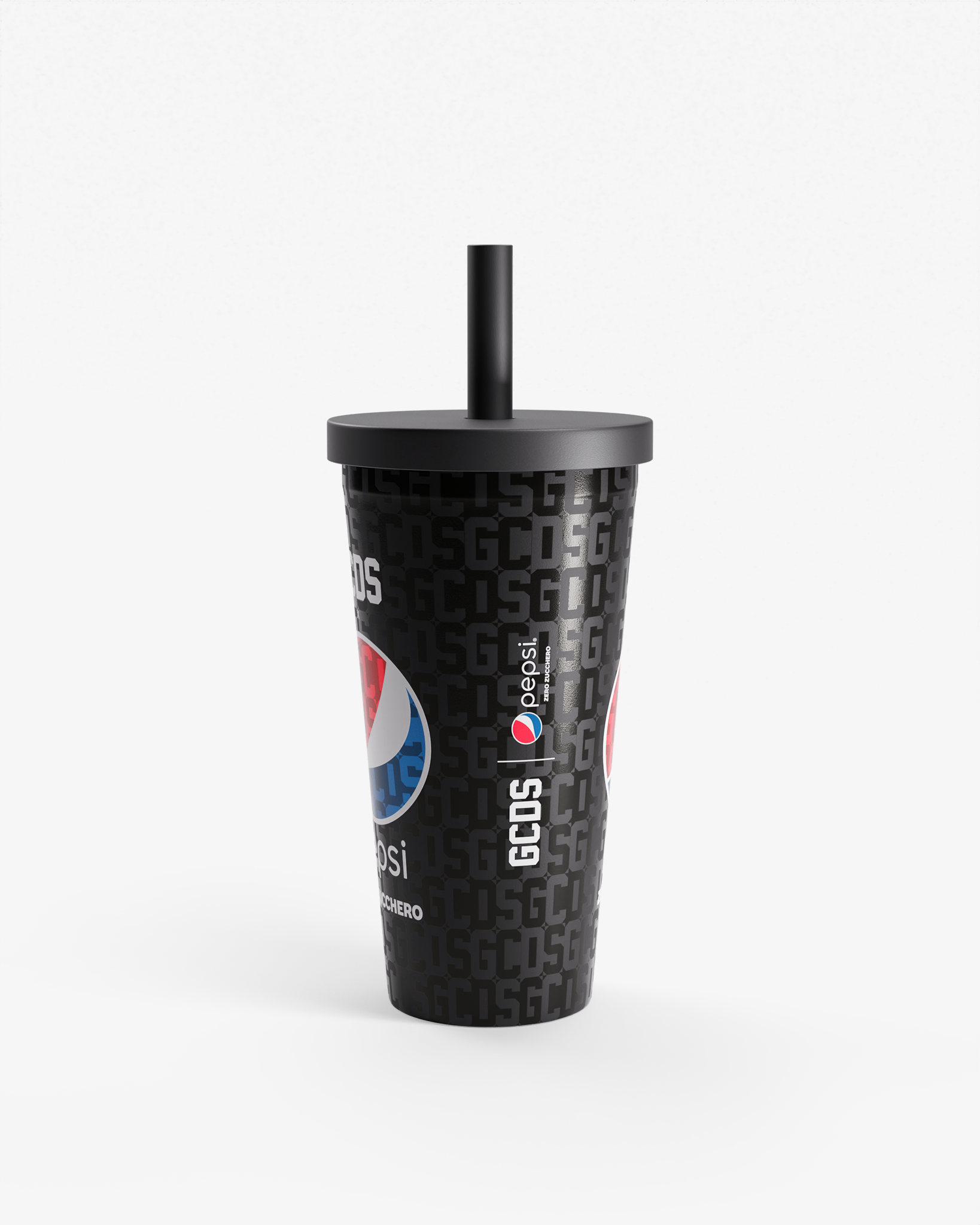 Limited edition Gcds x Pepsi matte black mug with all-over GCDS pattern.