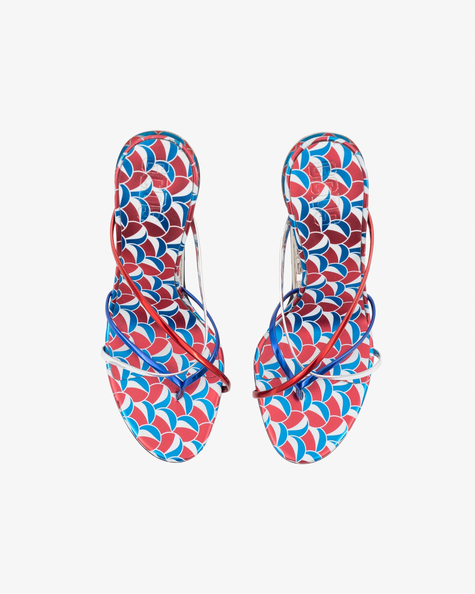 GCDS x Pepsi limited edition sandal featuring the iconic Morso heel and all-over Pepsi logo sole. Upper made from a mix of multicolored crisscrossed leather flats with flip-flop slingback. Rounded toe.