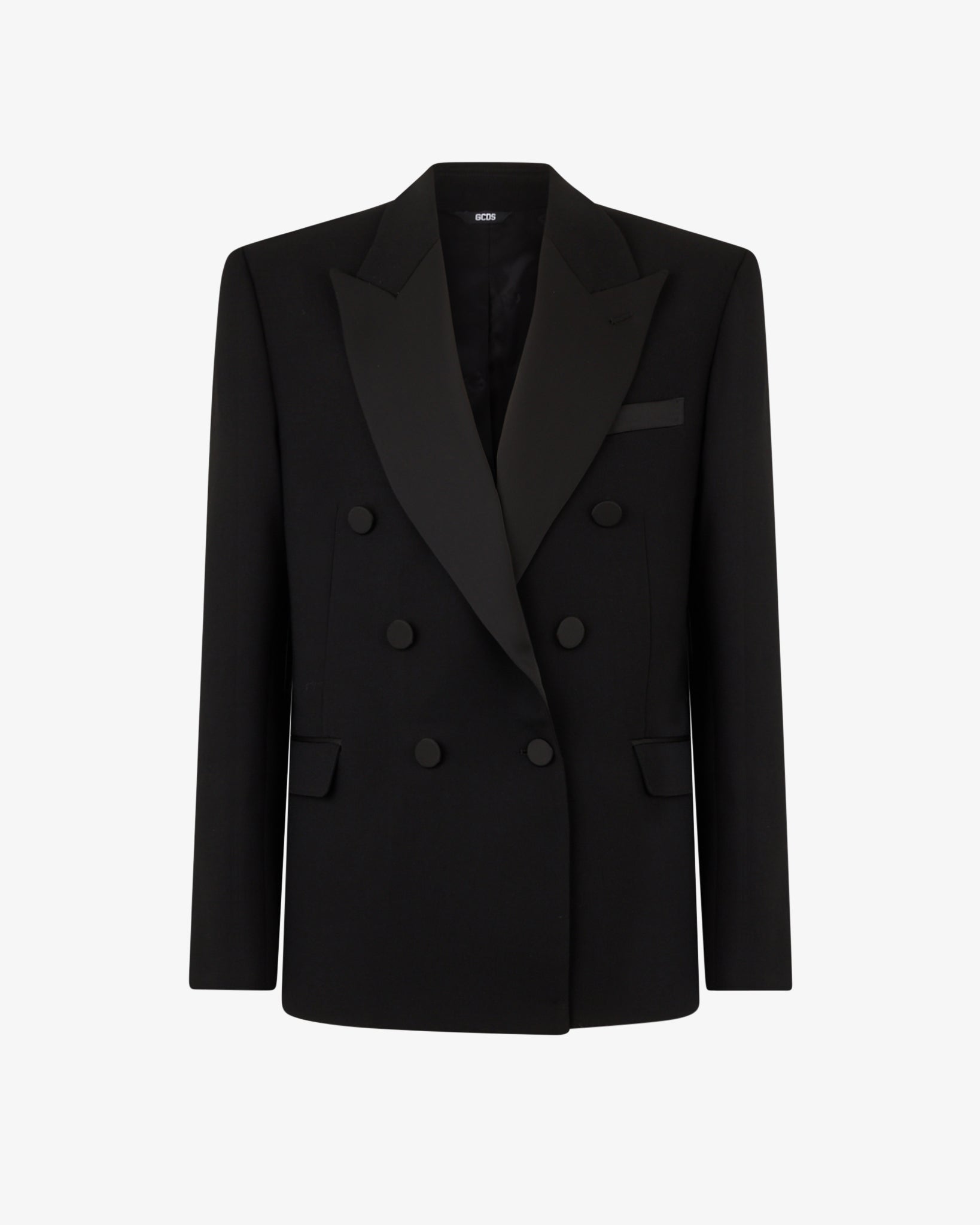 Double-breasted blazer features covered buttons, a peaked lapel, and long sleeves. It offers a regular fit with side pockets. The design is highlighted by glossy lapels and buttons contrasted against a matte base.