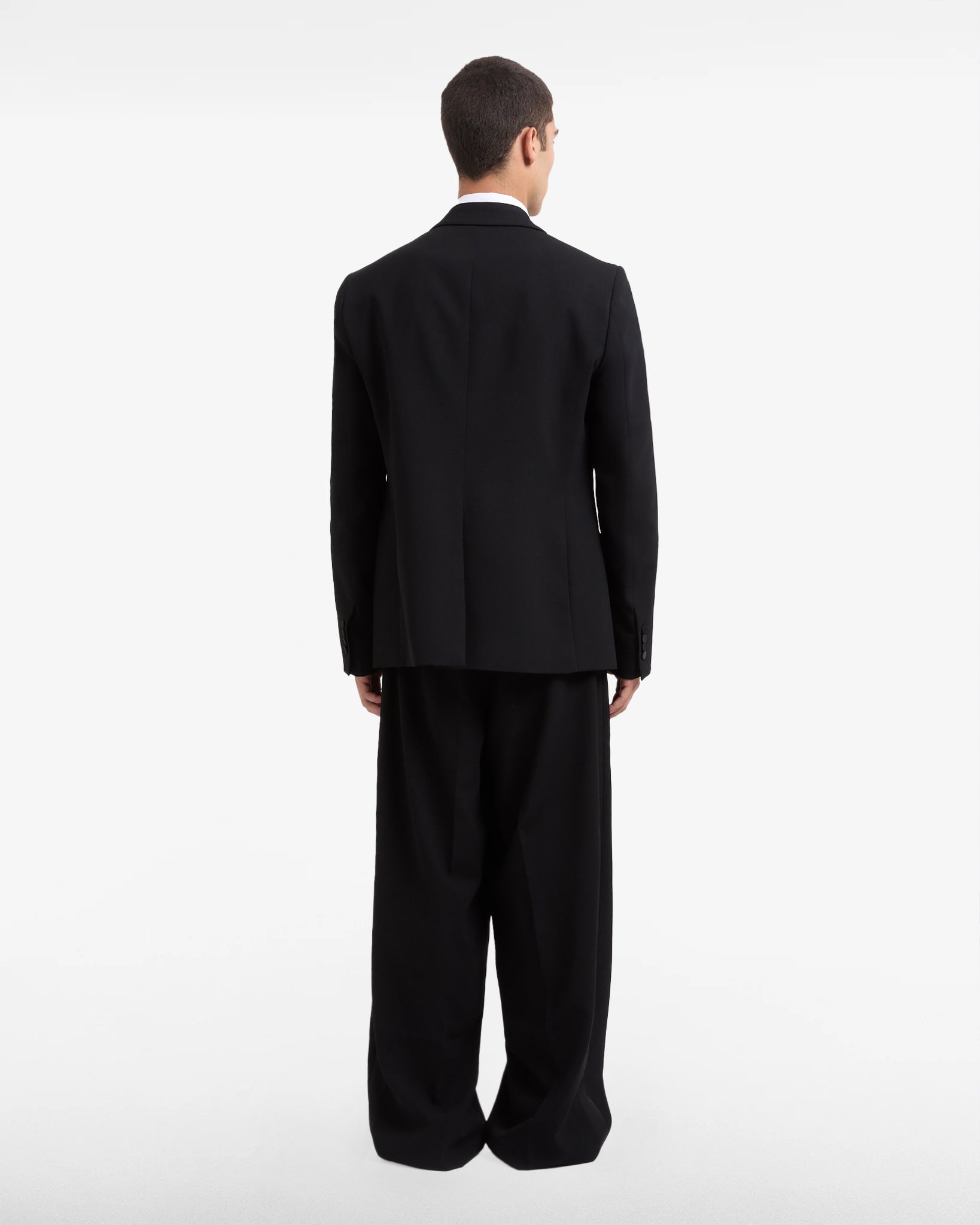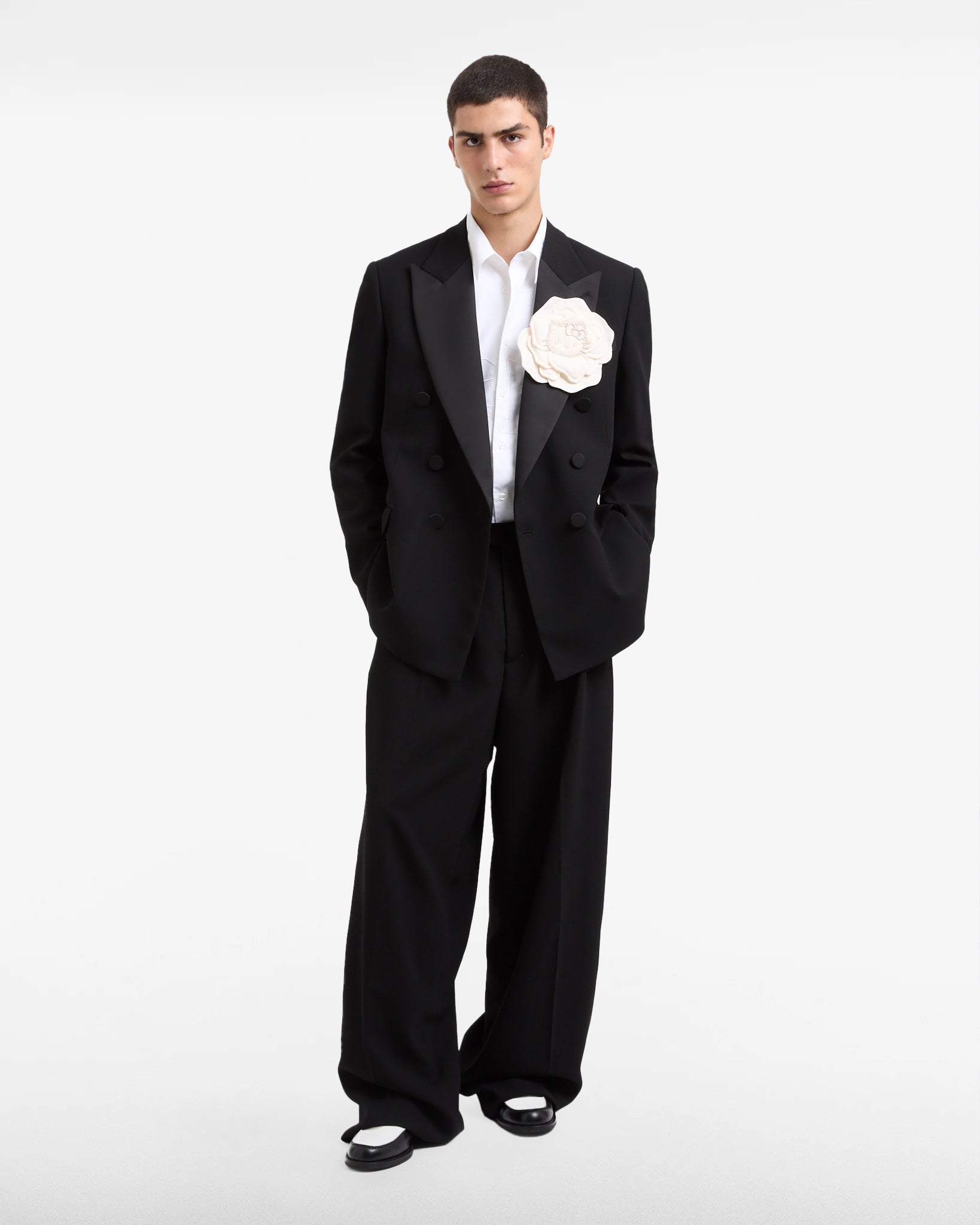 Skip to contentDouble-breasted blazer features covered buttons, a peaked lapel, and long sleeves. It offers a regular fit with side pockets. The design is highlighted by glossy lapels and buttons contrasted against a matte base.
