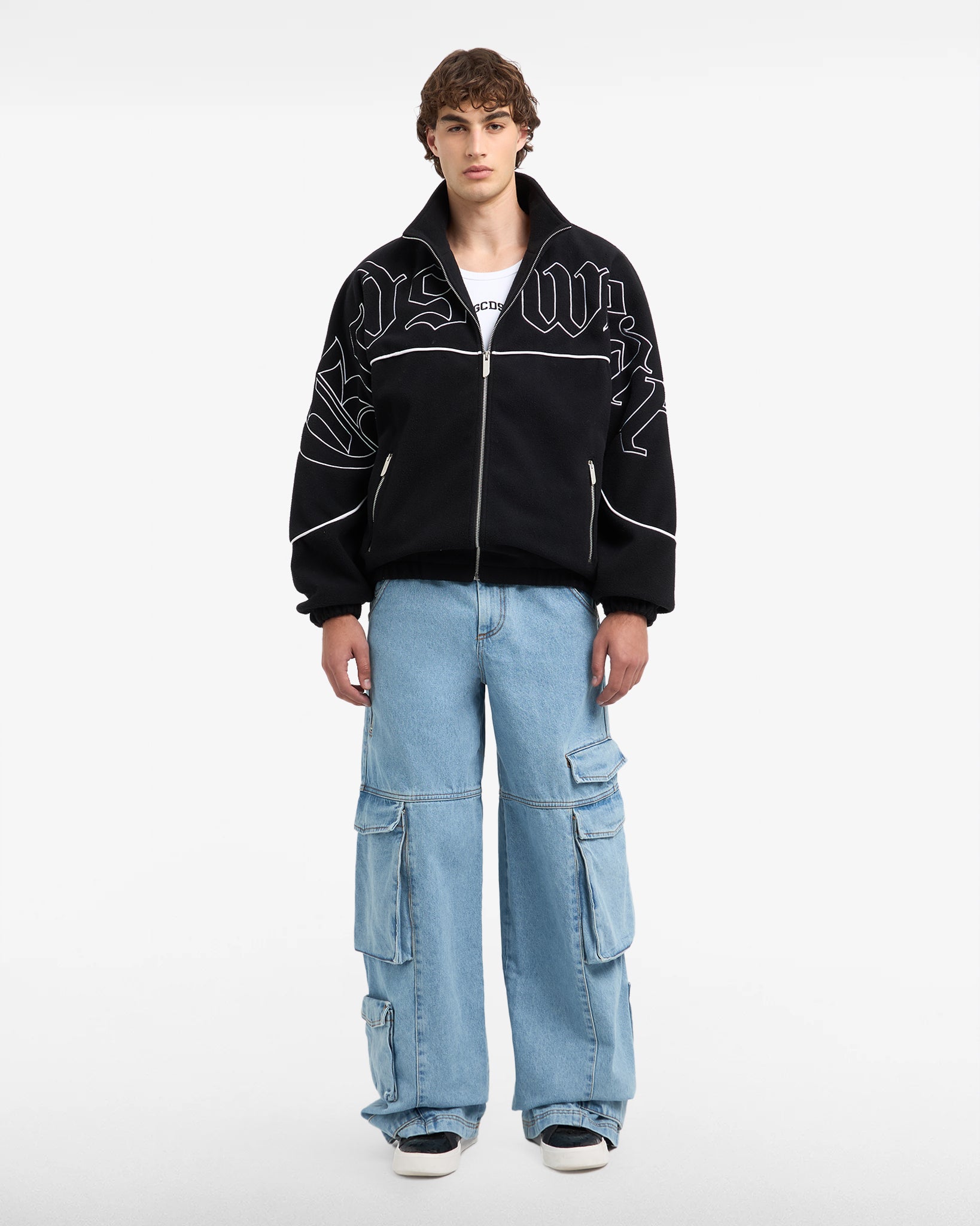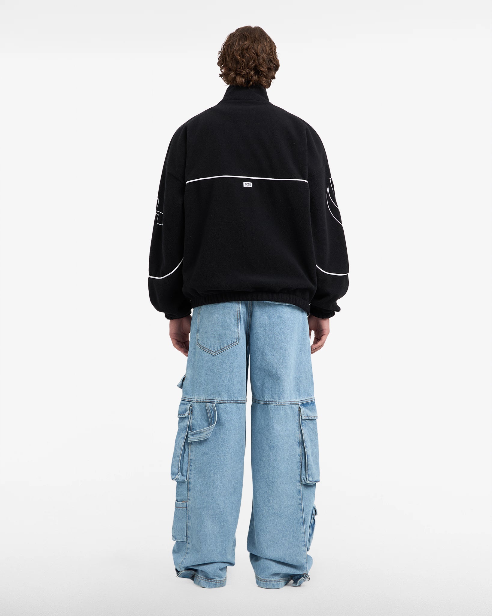 Fleece over truck featuring an embroidered logo on the front and piping details.