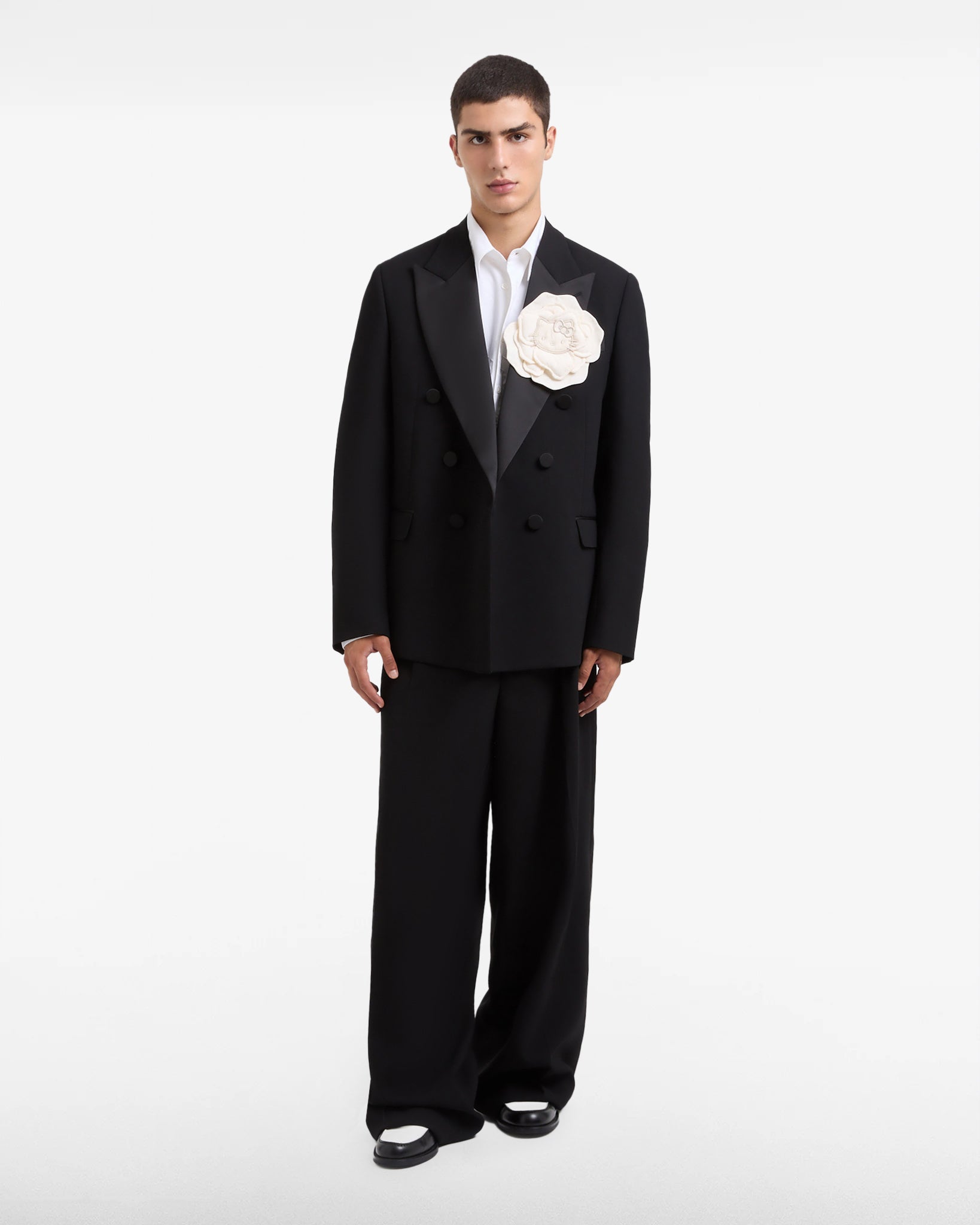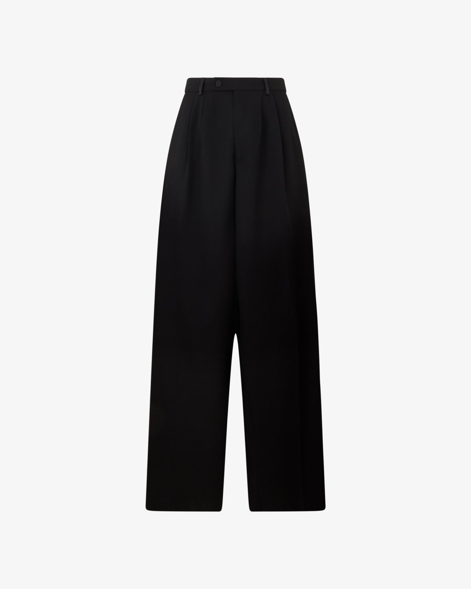 Classic cut oversized pants crafted from fluid fabric. Waist with front pleats and covered button front closure. Side pockets and back welt pockets with shiny side bands.