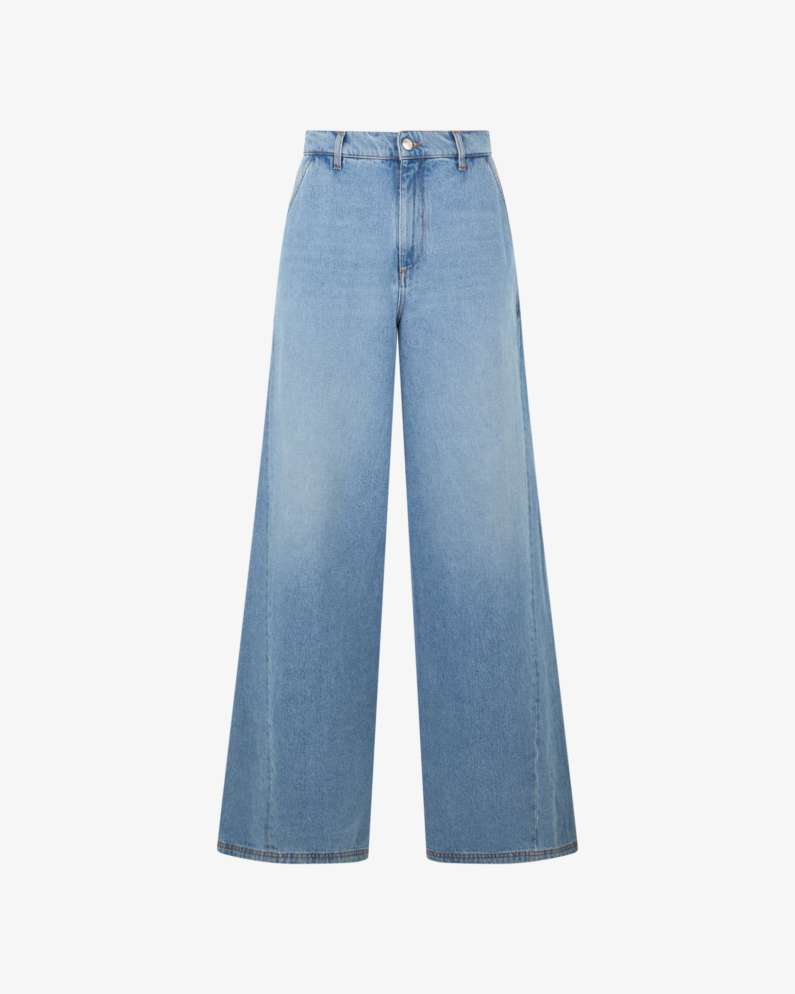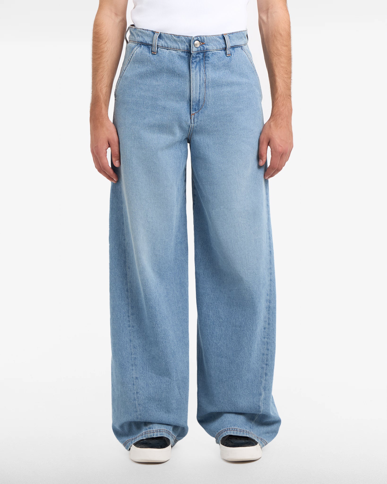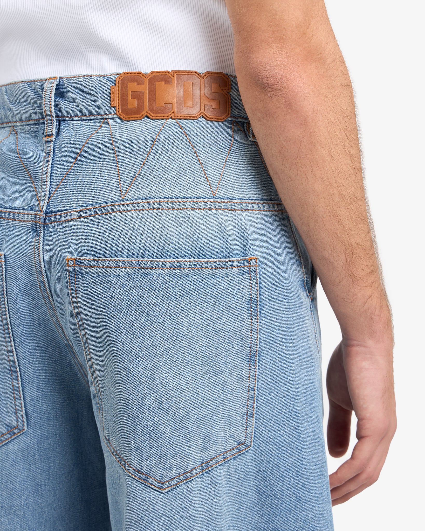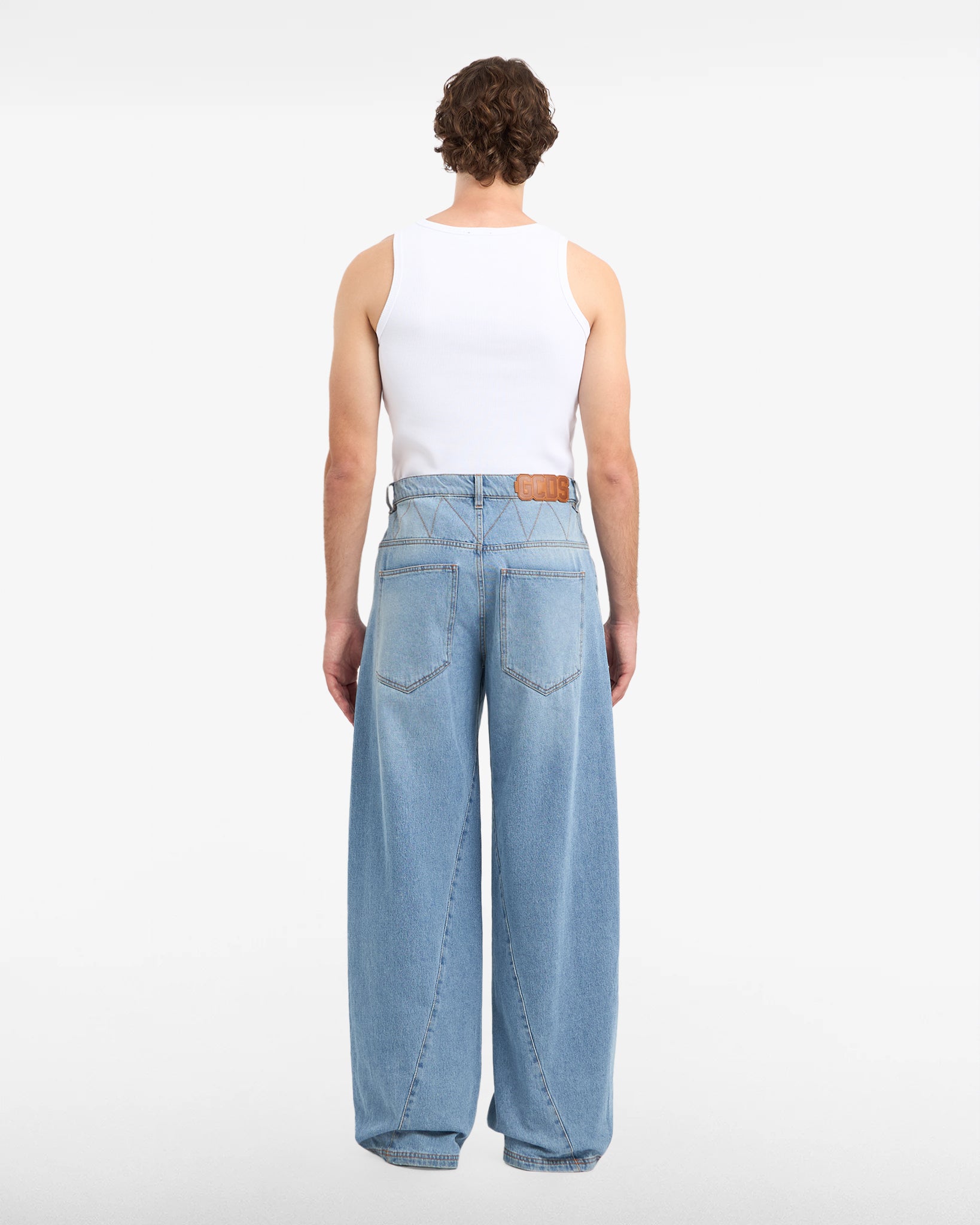 Oversized fit stone washed denim pants, featuring a subtle bleached effect and contrasting tobacco-colored stitching. The side cuts are diagonal.