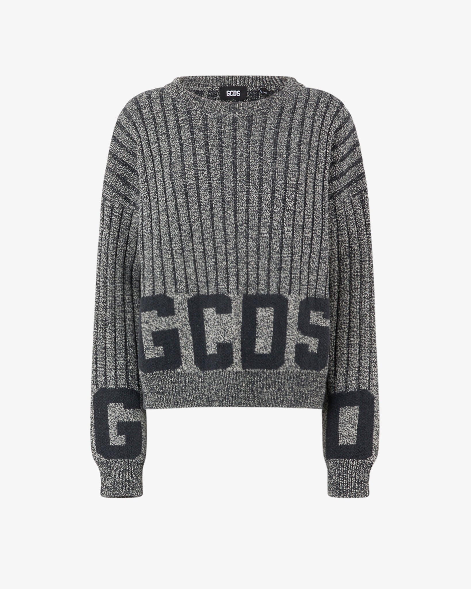 Ribbed crew-neck sweater in cotton blend with oversize fit. New logo band at front hem and sleeve cuffs.