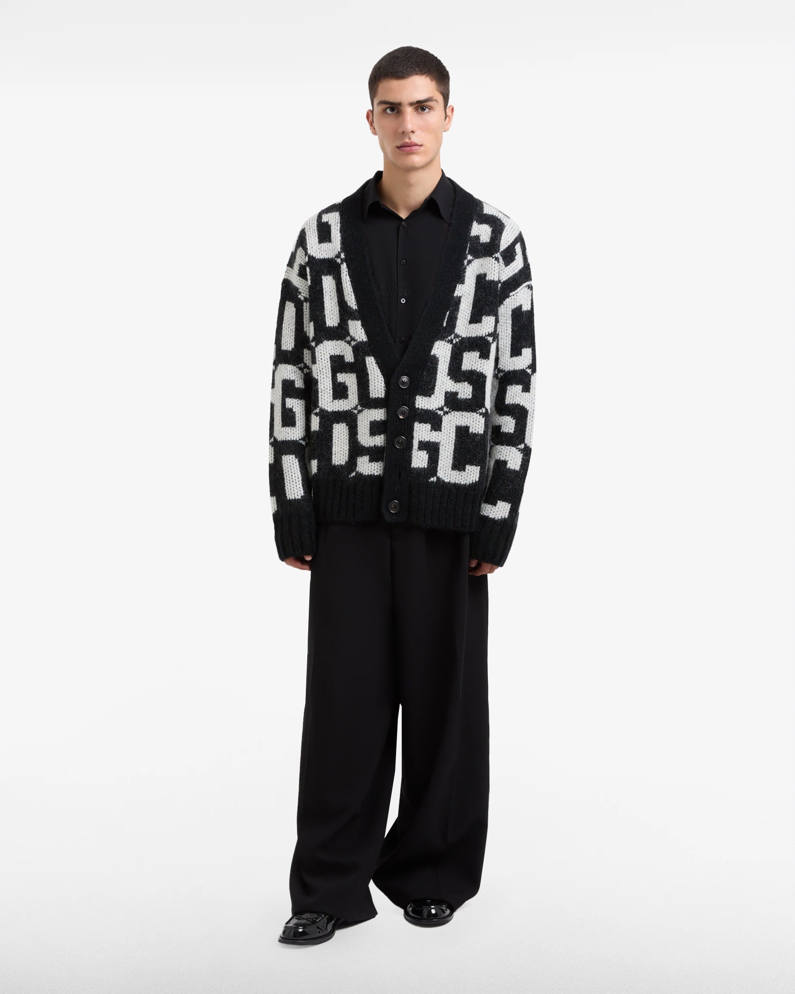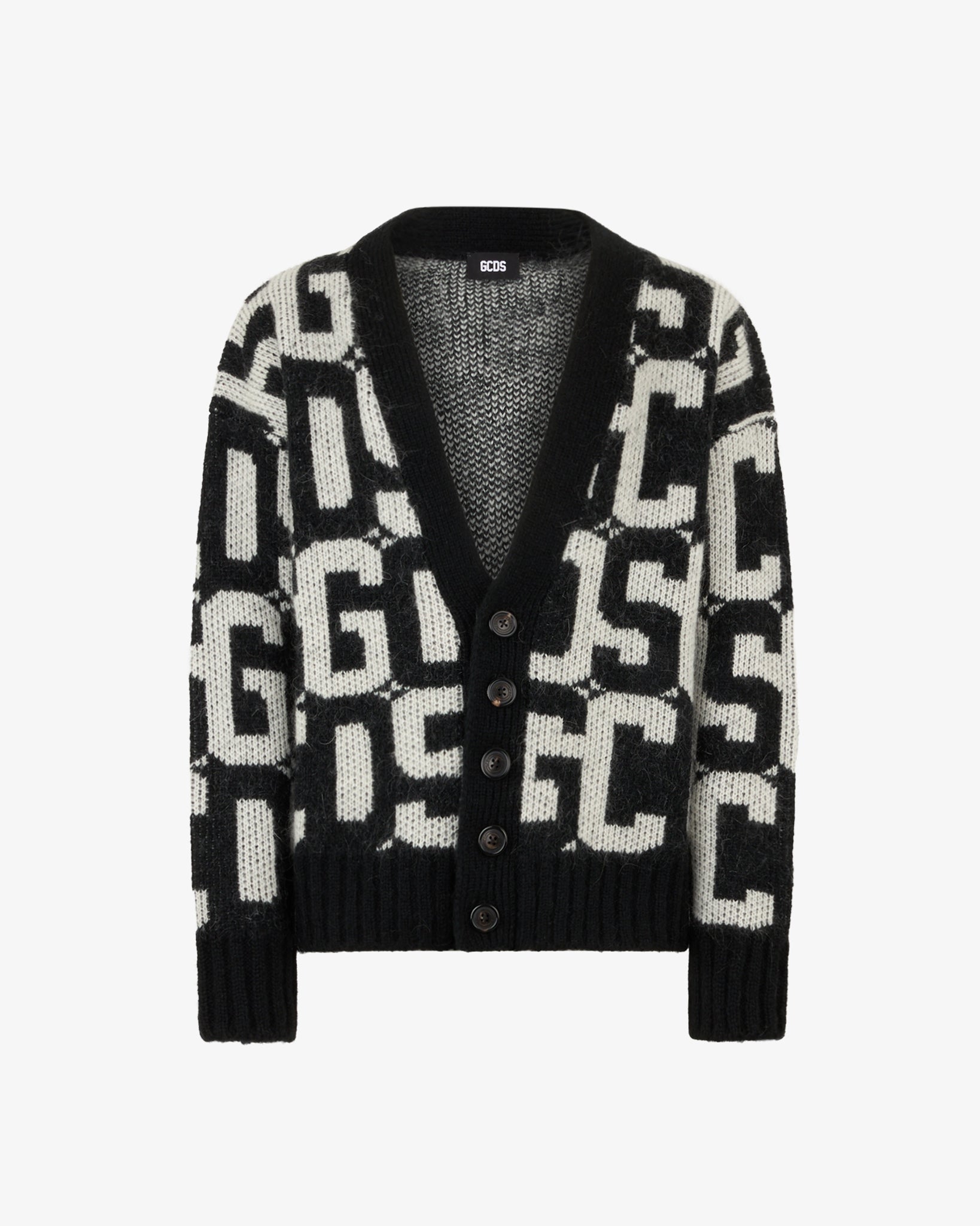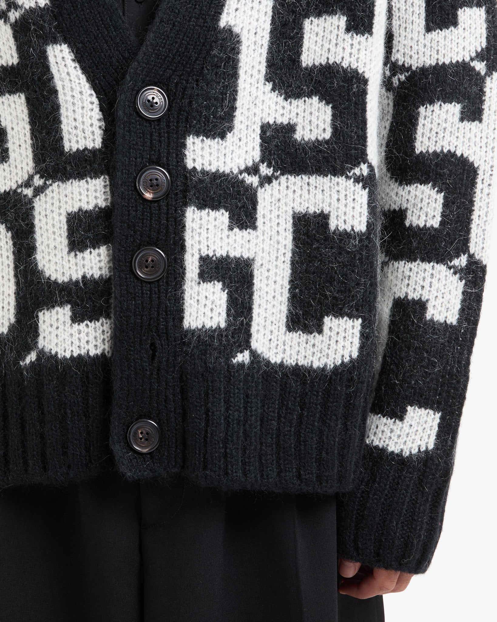 Cardigan with jacquard monogram logo, mohair effect and contrasting ribs. Oversized fit.
