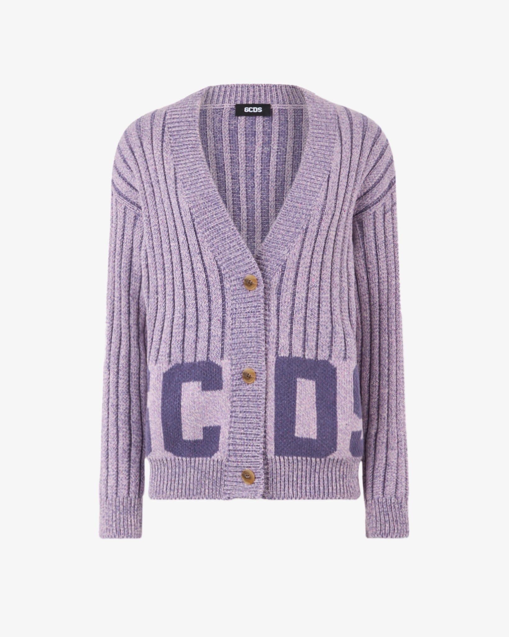 Skip to contentCardigan crafted from two-tone vanisé rib knit. It features a low band logo on the front and faux horn branded buttons.