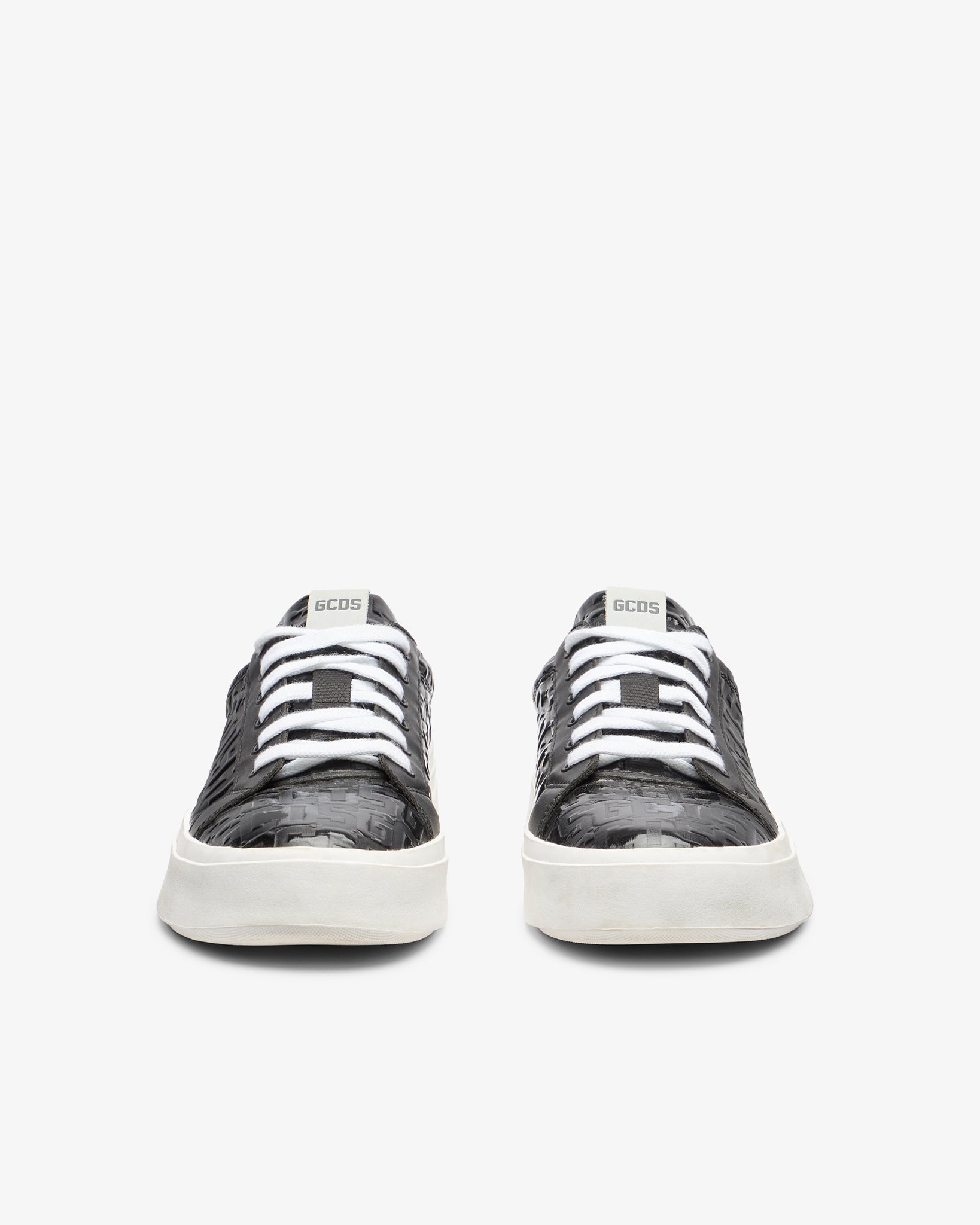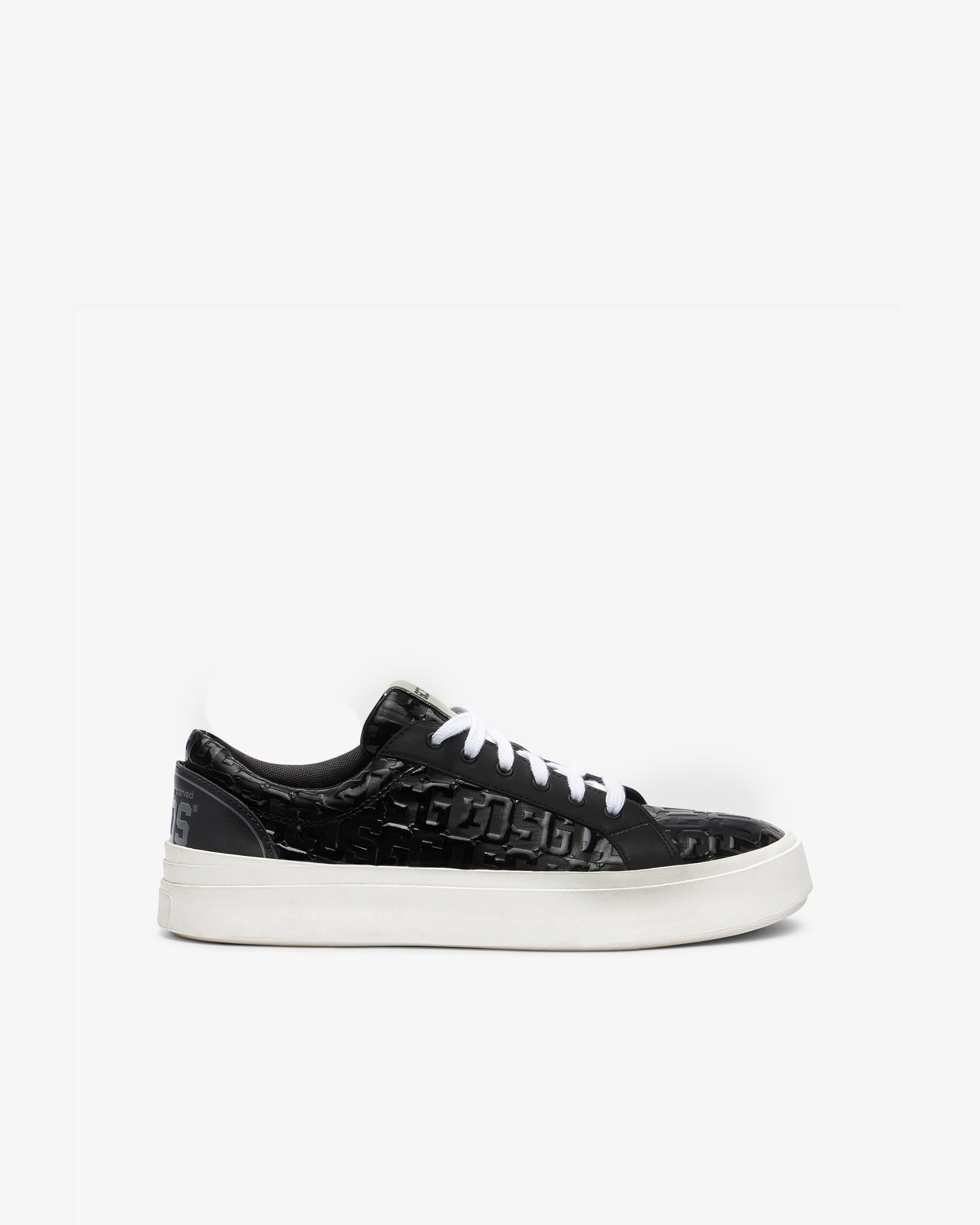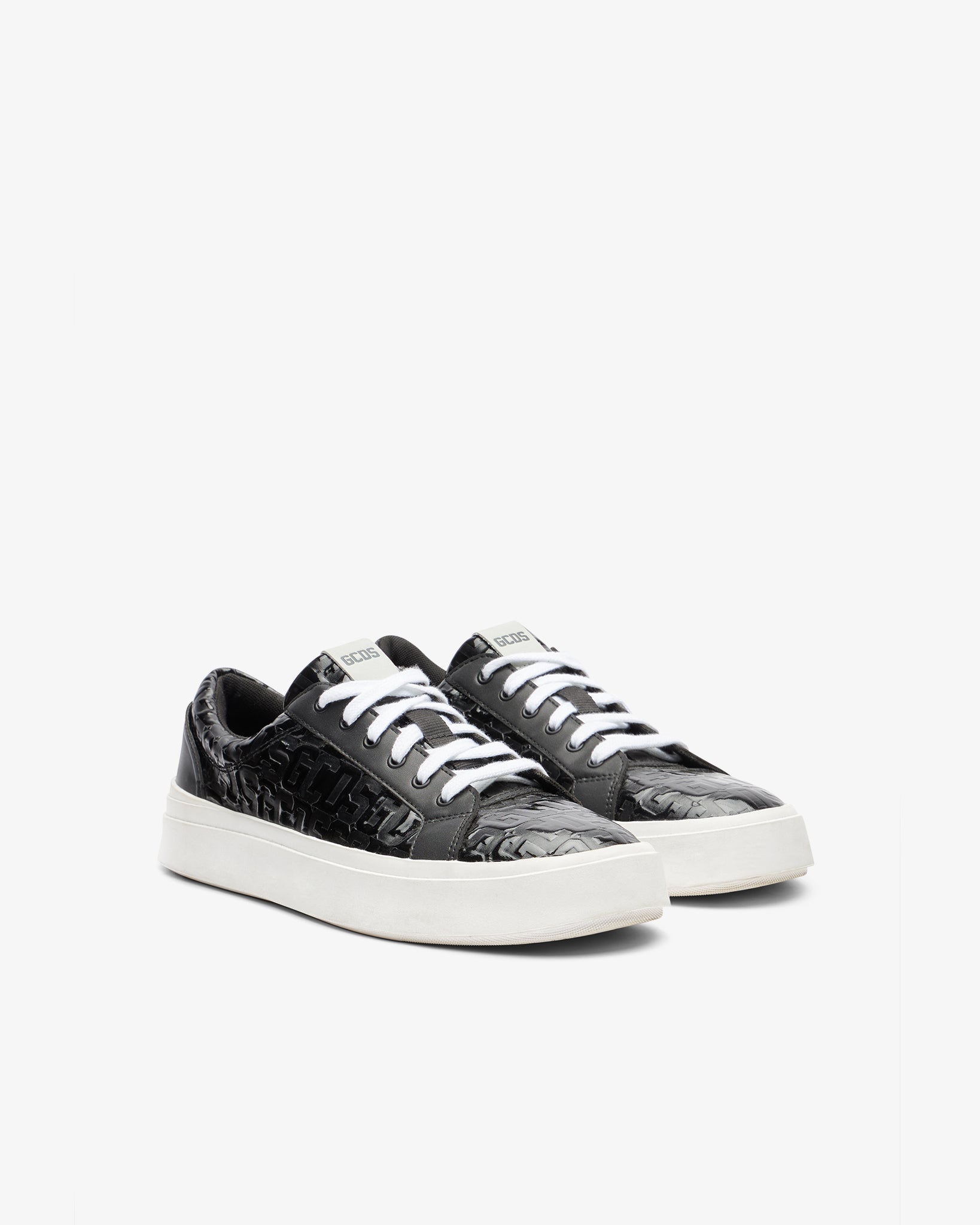 GCDS Bucket sneakers with a white-colored rubber box bottom. The upper features embossed monogram patent leather and smooth black details. The lining matches the upper, there are flat, white-colored cotton laces and the fussbett is covered in black faux leather with logo-embossed branding.