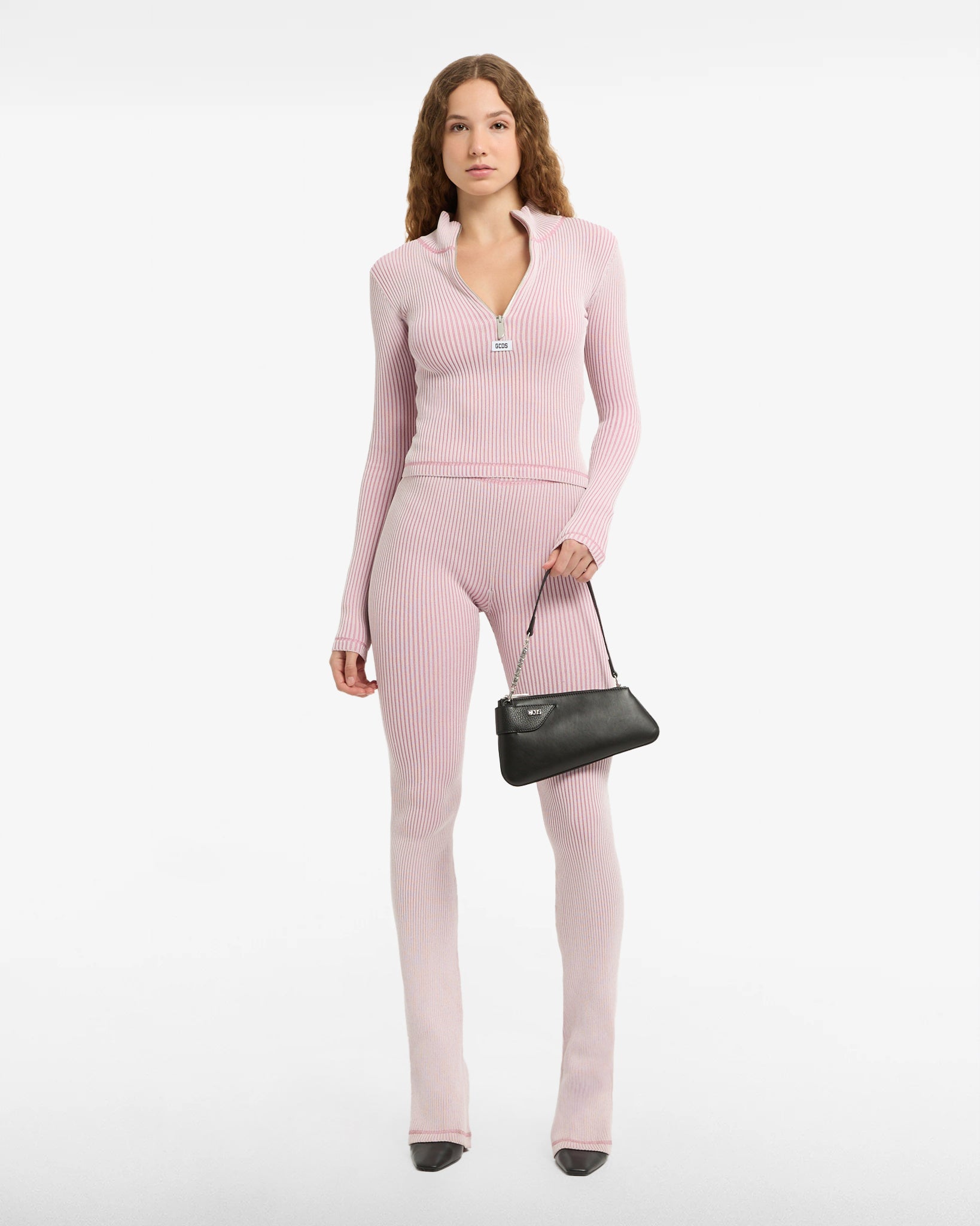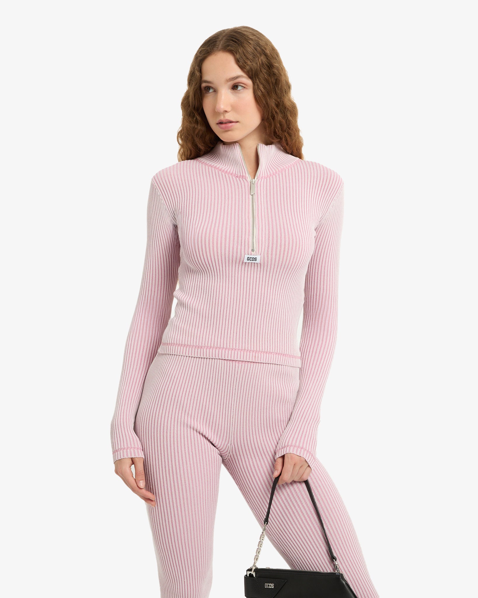 Long-sleeved half-zip sweater featuring of two-tone vanisé rib knit. High collar and zipper front with sandblasted nickel comma logo puller. jacquard logo label on center front. Contrast coverlock details.
