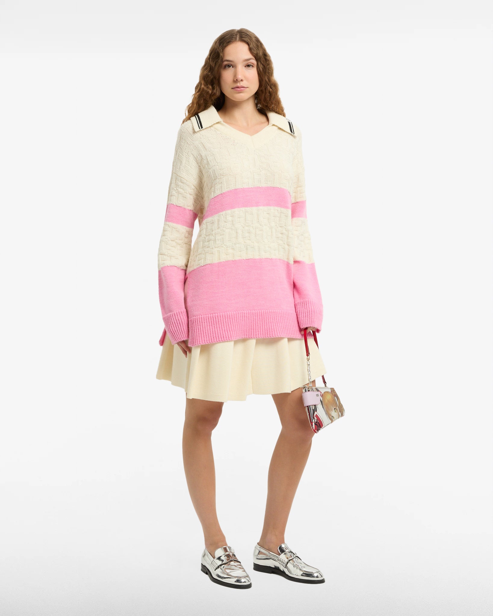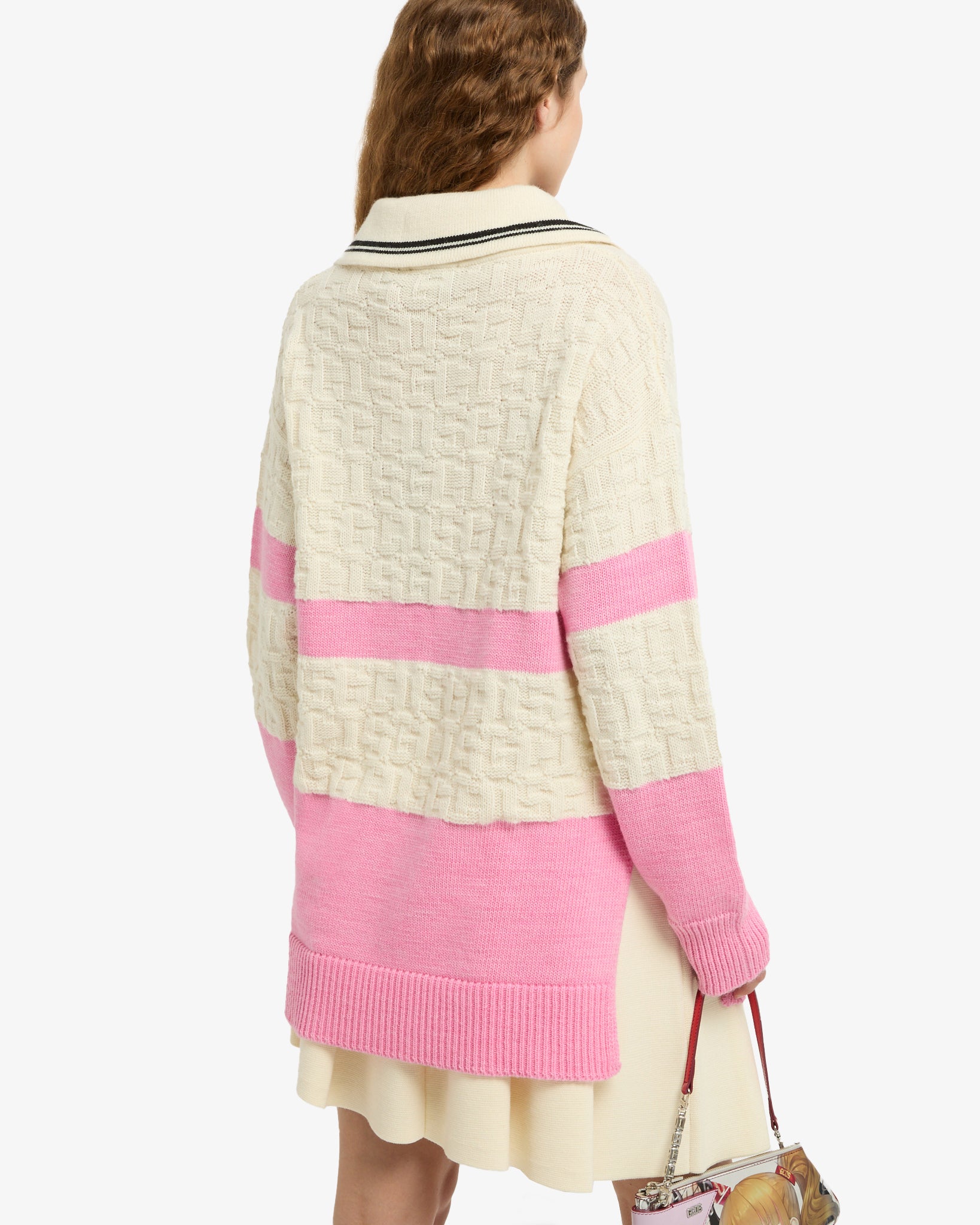 Oversized V-neck sweater featuring a polo collar with logo. The body is crafted with a monogram using jacquard technique on both sides, interspersed with pink knit bands.