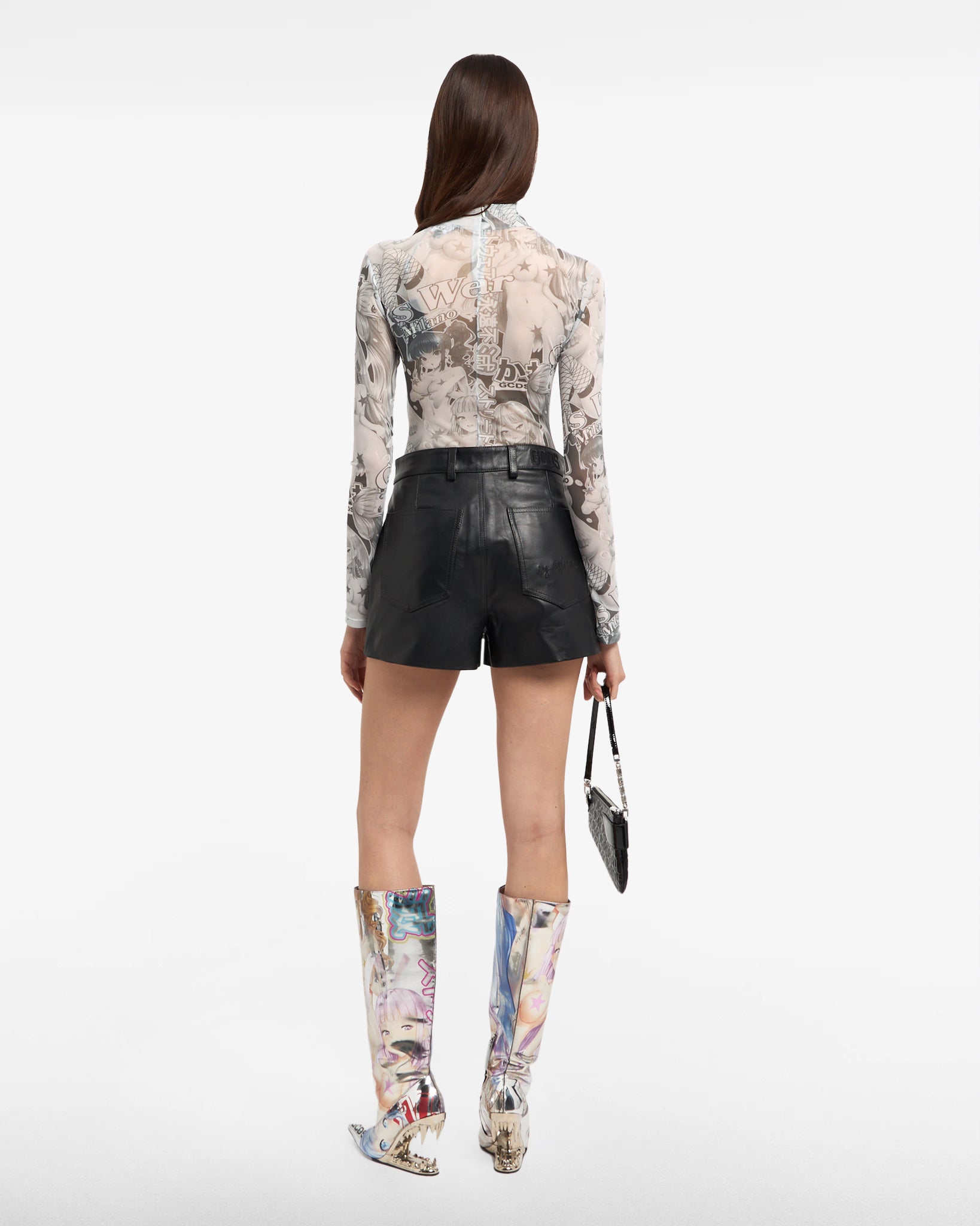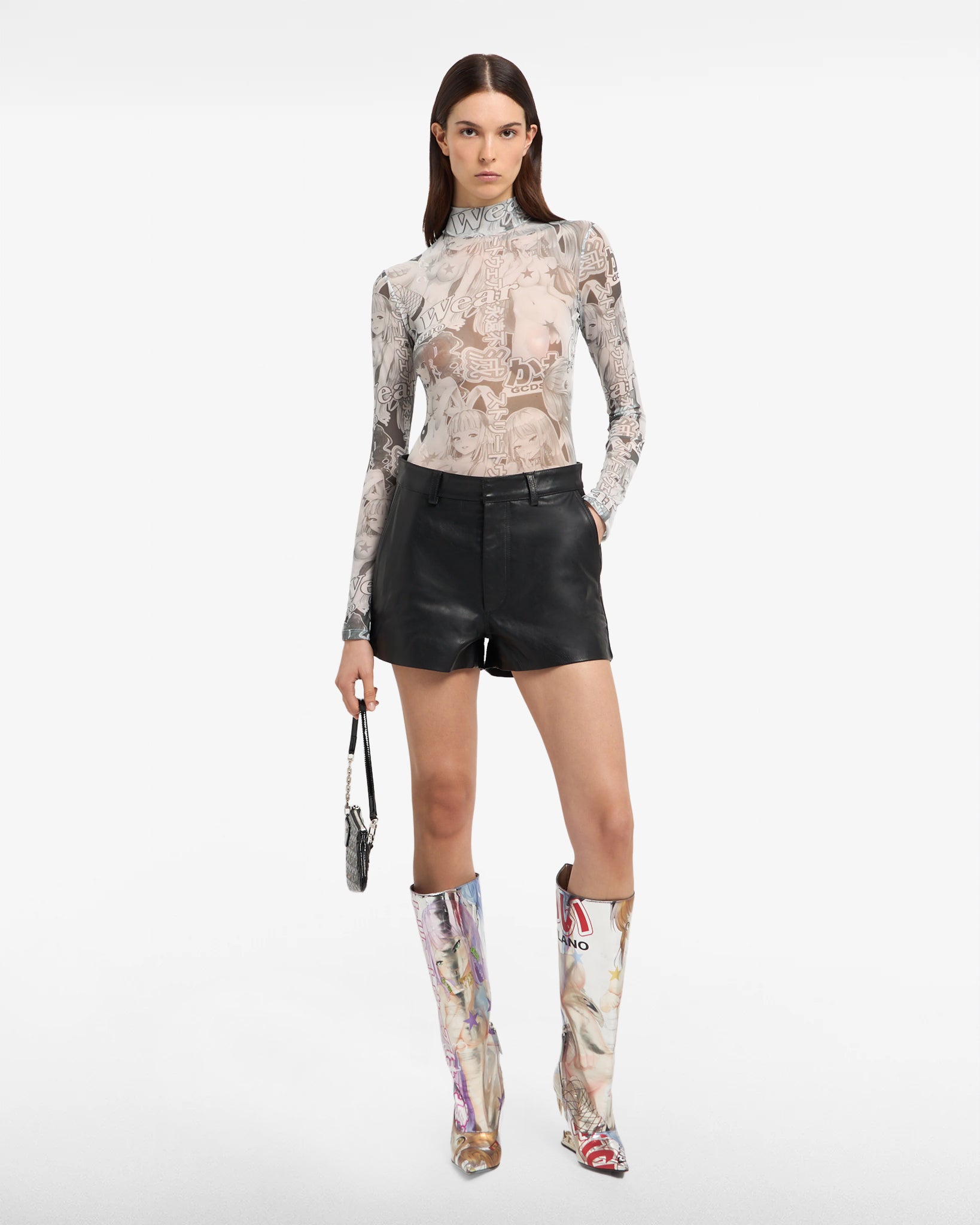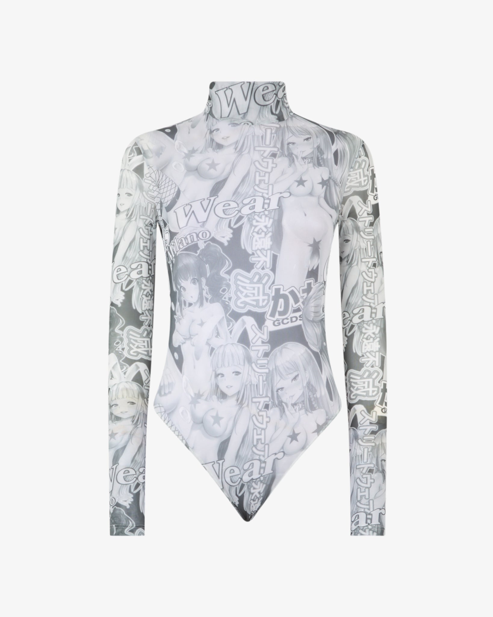 High neck bodysuit featuring long sleeves in stretch tulle with hentai print.