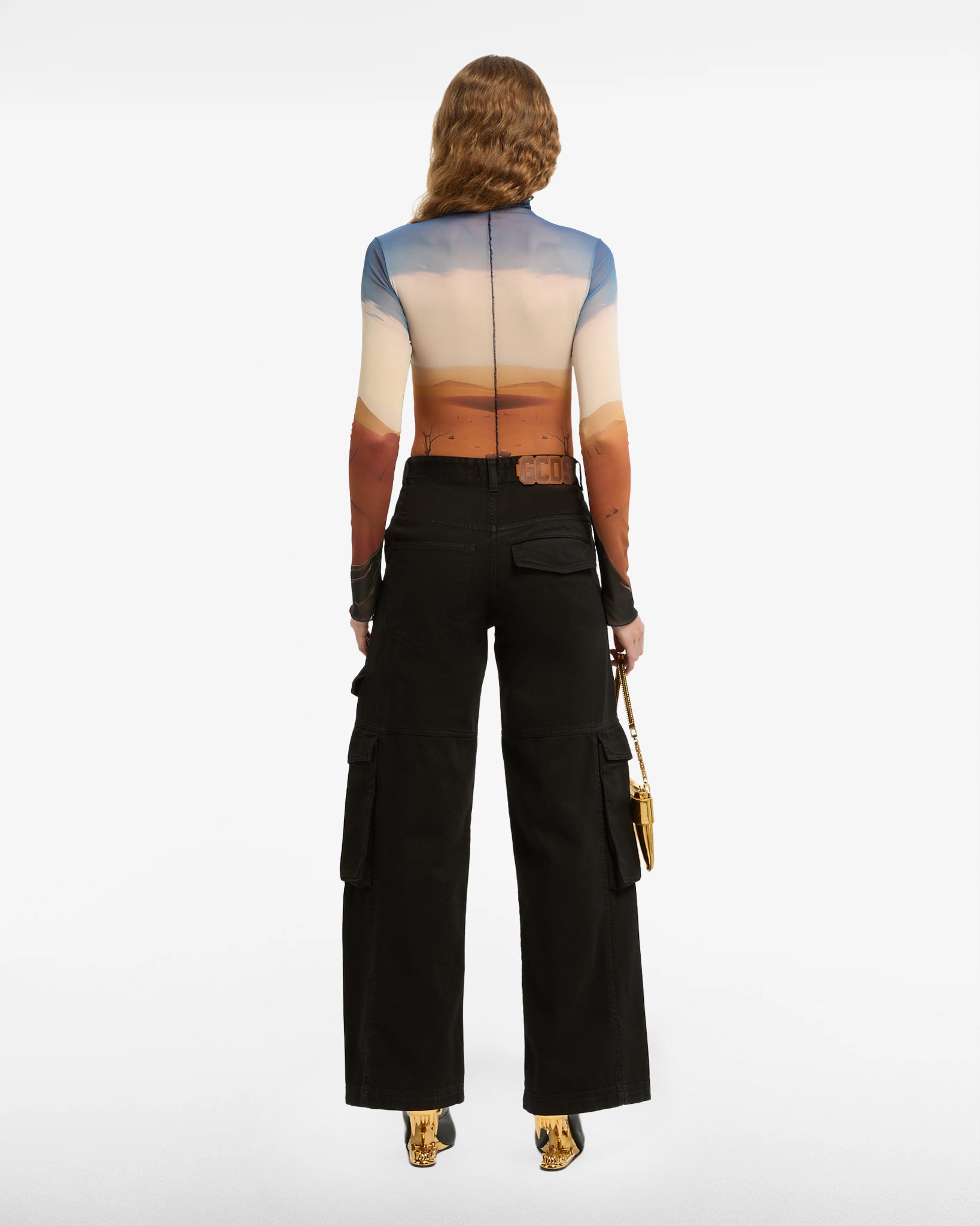 Skip to contentHigh-necked bodysuit with long sleeves in stretch tulle with "Creatures" print.