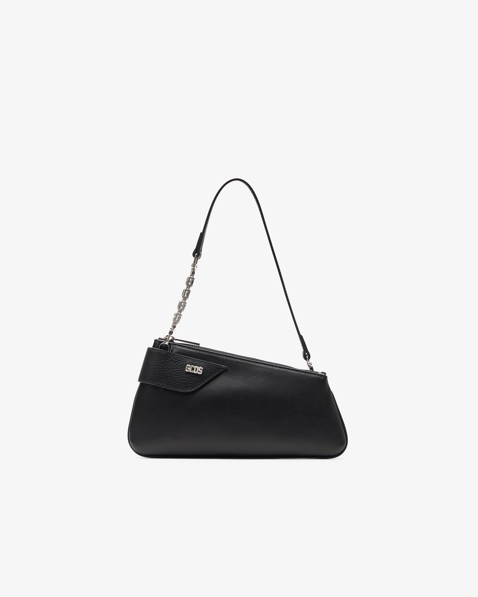 Comma Notte bag, small size, made of black leather. Asymmetric silhouette enhanced by piping and leather with black metallic details. Removable thin calfskin leather handle with metalized "GCDS Cube" chain module. Internally, black jacquard logo lining and asymmetrical card pocket.