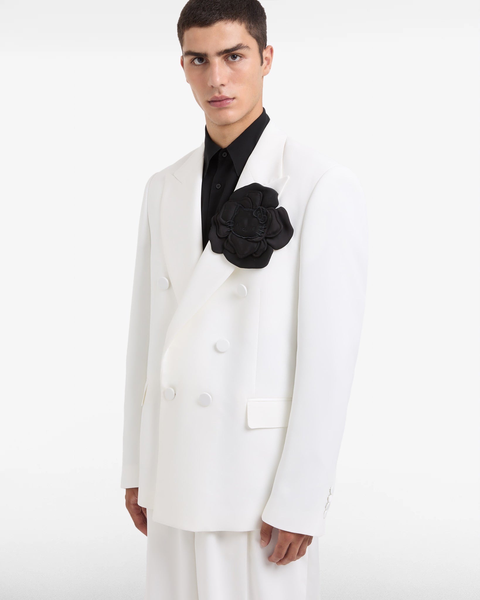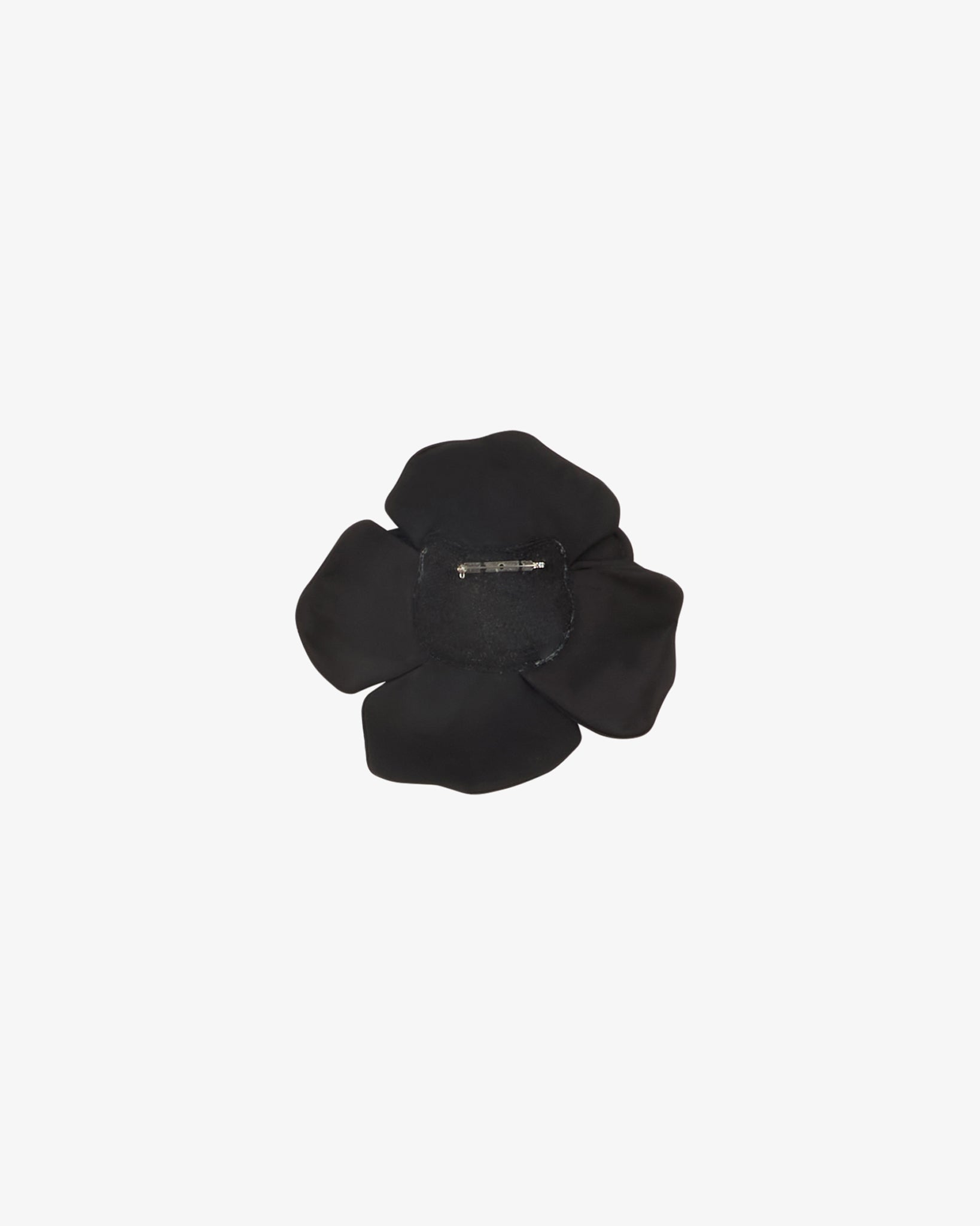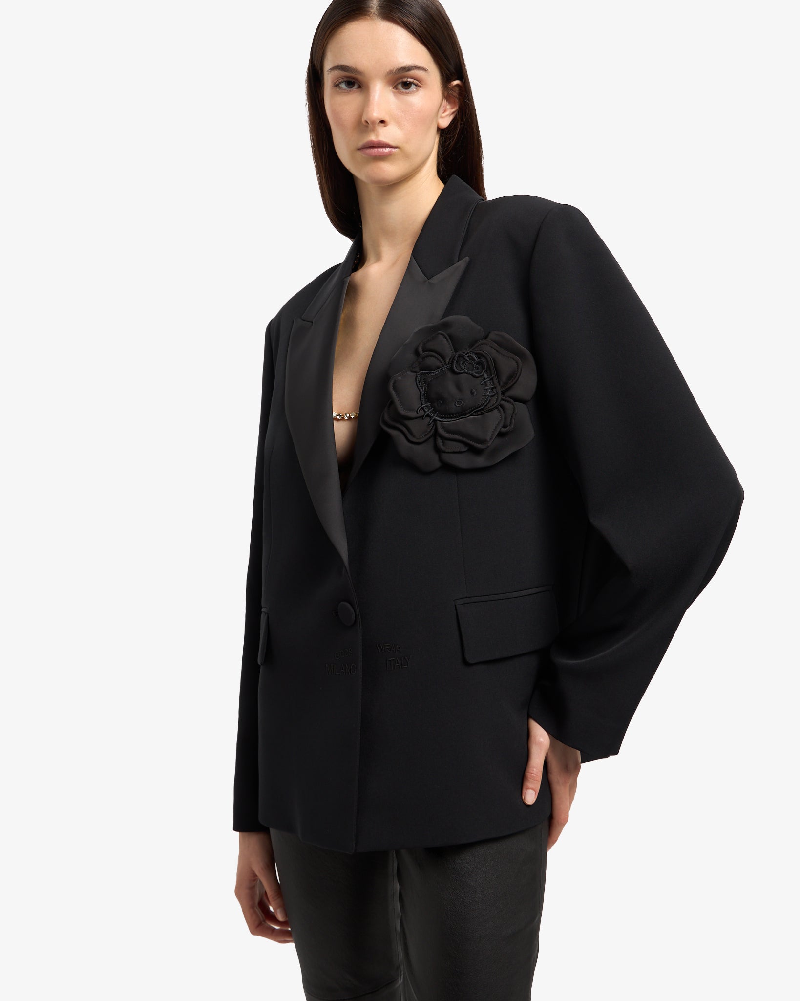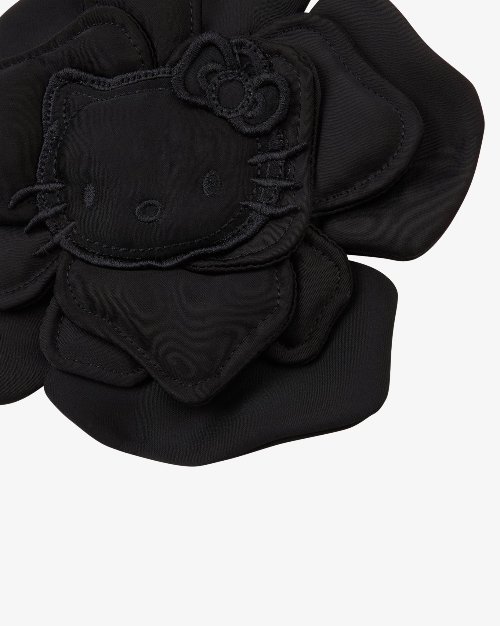 Satin flower-shaped jeweled fabric brooch depicting Hello Kitty.
