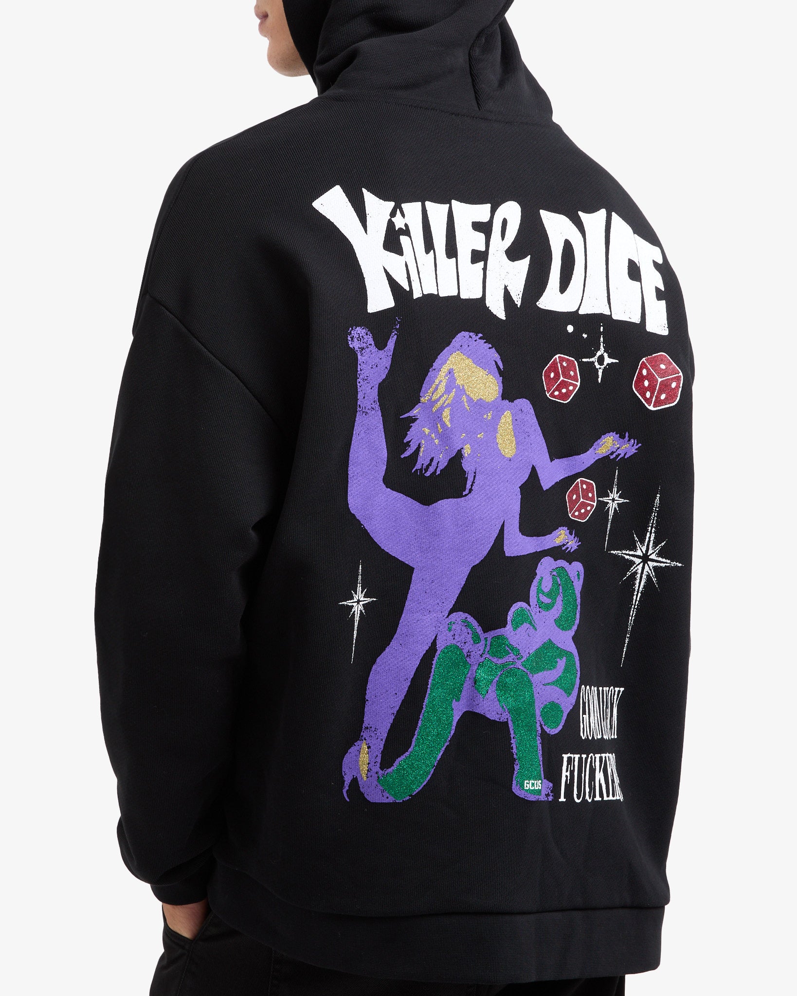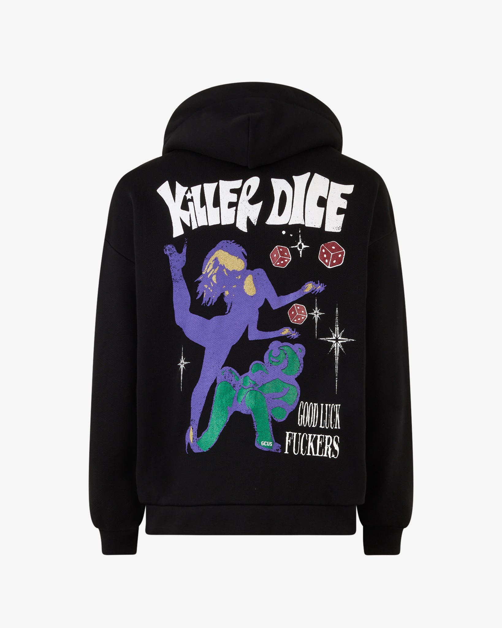 Oversized sweatshirt with embroidered logo on the front and mixed media print on the back.