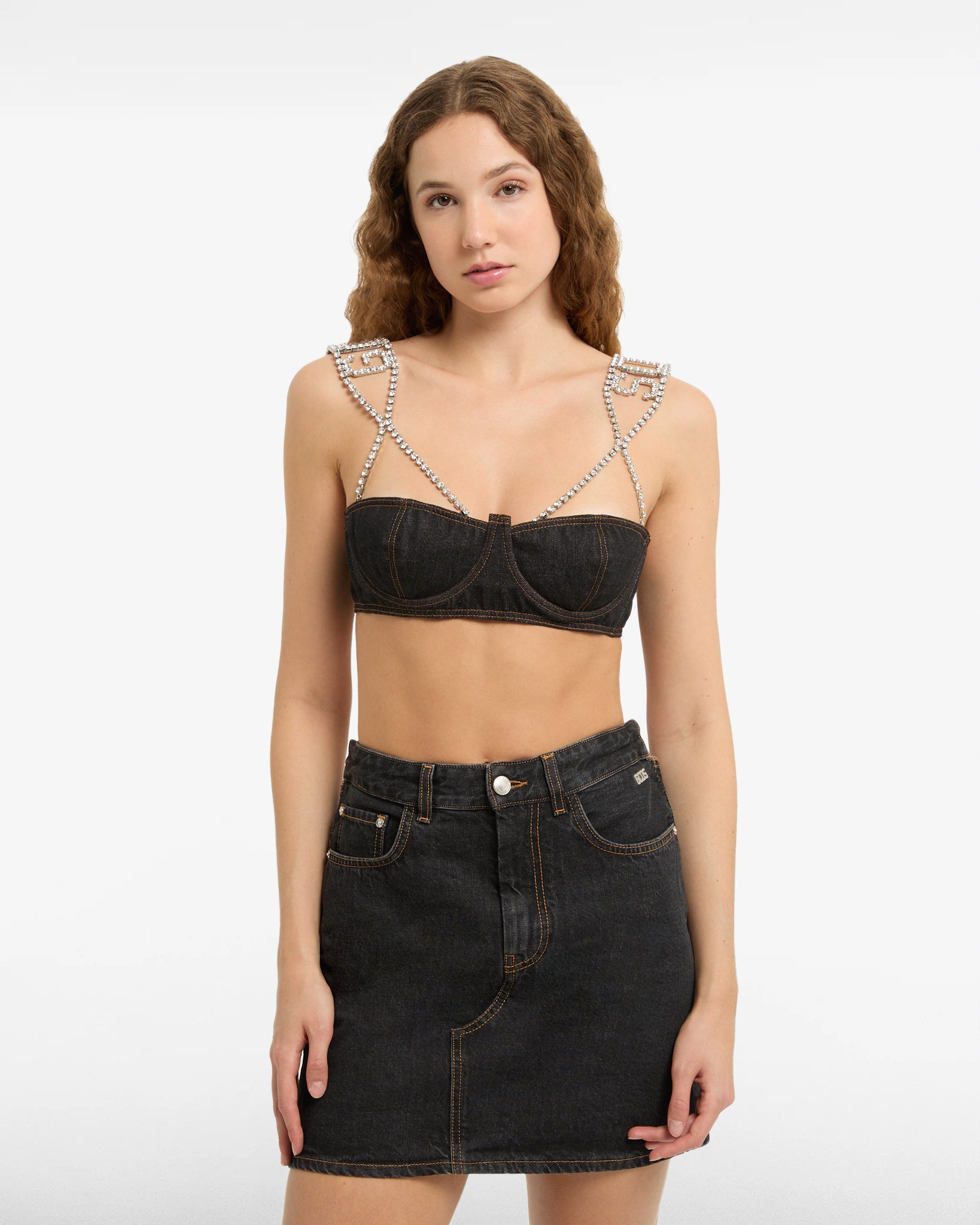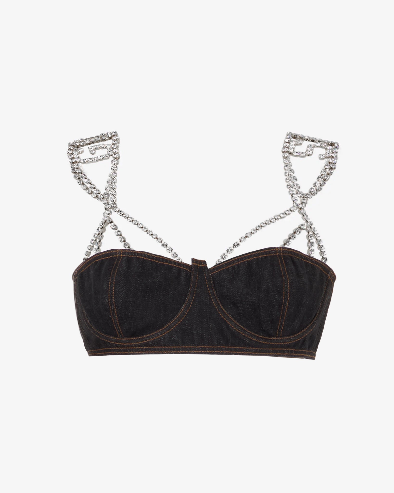 Denim mini top with balconette cups in black stonewashed denim. The distinctive detail is provided by the jewel straps with crystal logo.