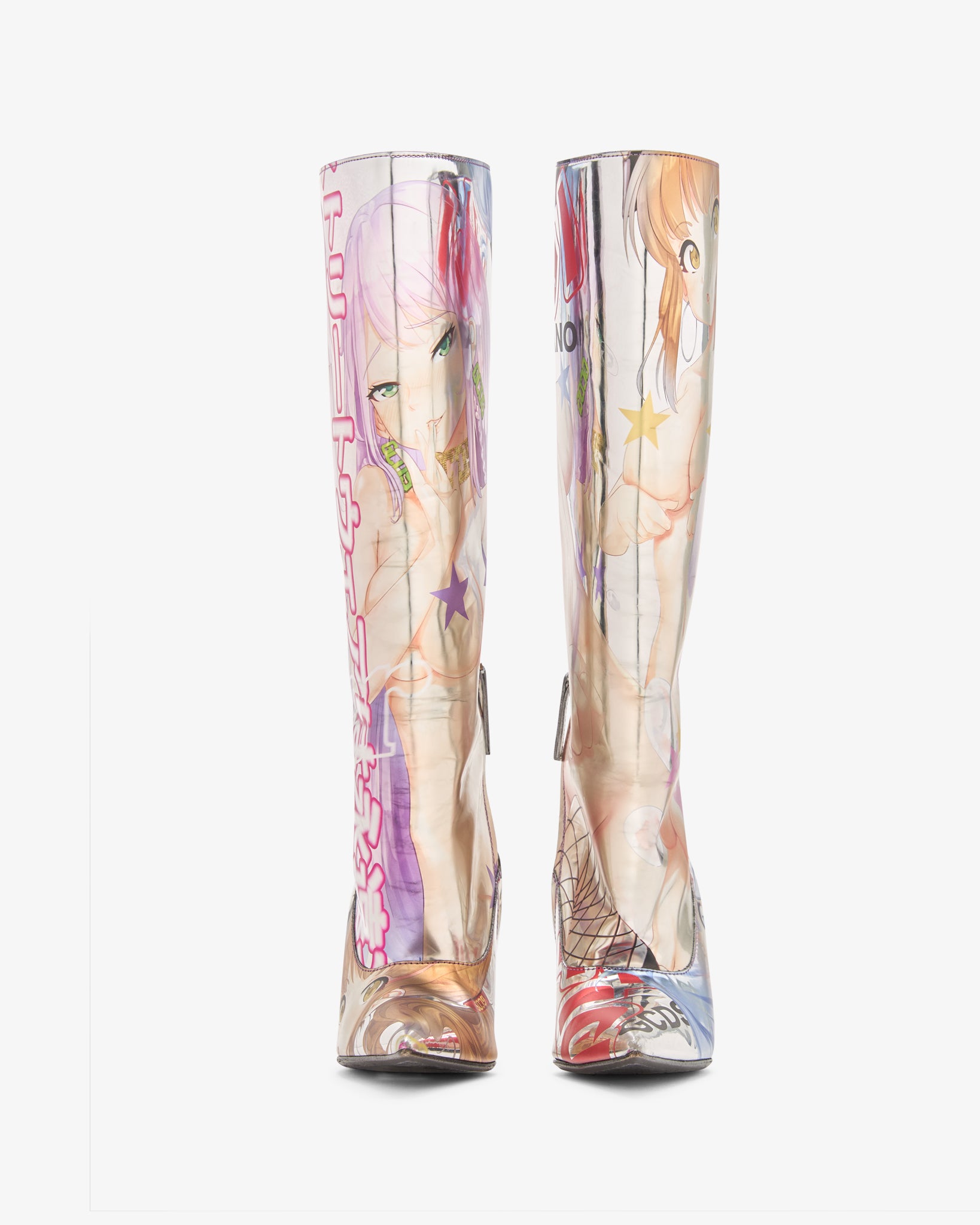 Knee-high boots crafted from silver laminated material, featuring multicolor faded Hentai artwork. These boots are distinguished by the iconic "Morso" heel and a pointed toe silhouette. The leather sole includes a hot-stamped GCDS logo.
